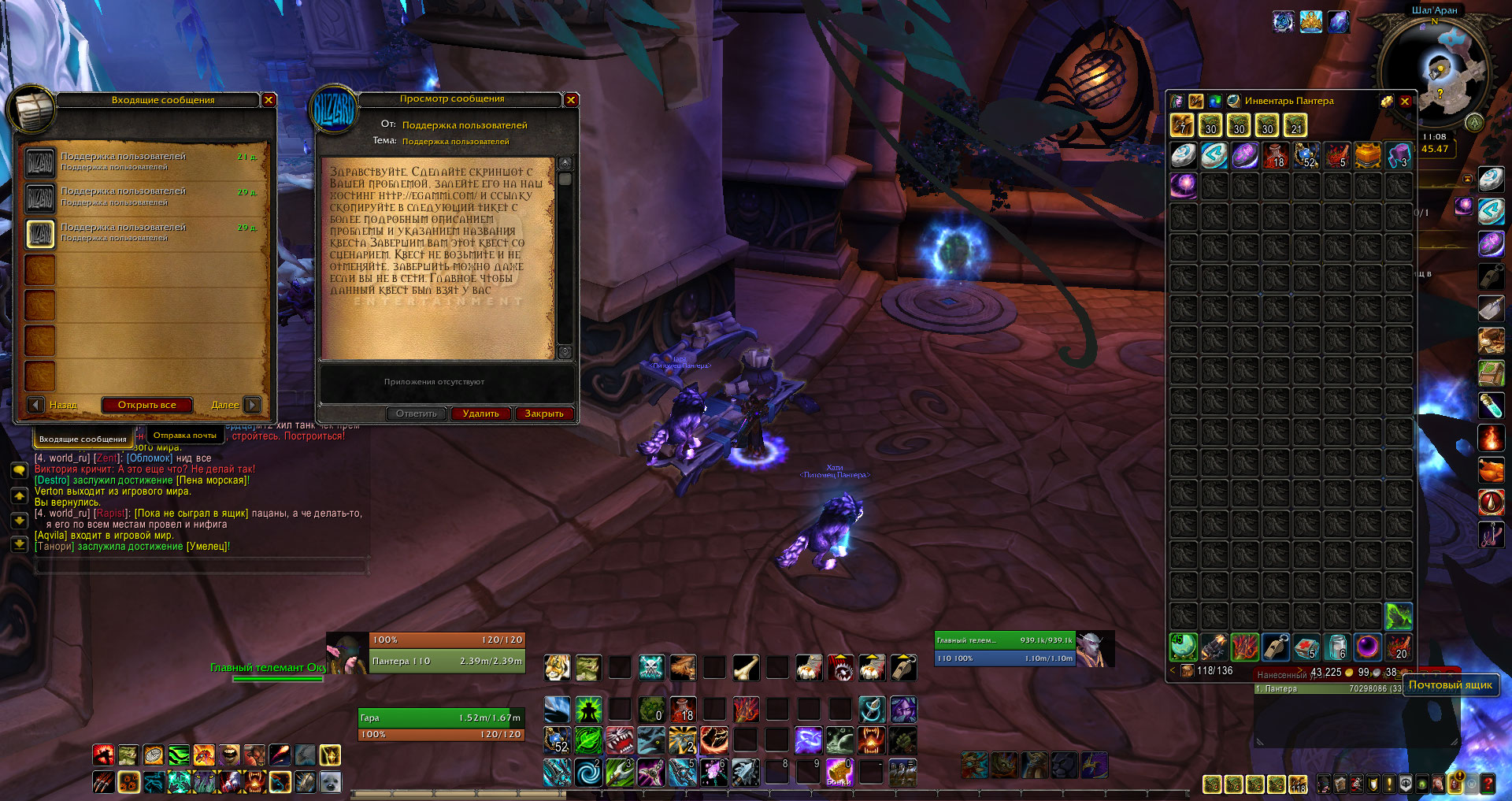 | Description | Здравствуйте. У меня тут есть уже тема с проблемой. 0018353 http://tracker.legionbugs.com/view.php?id=18353 Теперь из за этого квеста возникла вторая проблема. Потому что на других персонажах все нормально. Этим персонажем я не могу сдать в Сурамаре локальные задания видимо потому что Талиса застряла в сценарии этого квеста. И теперь у меня с ней нет диалога и я не могу сдать локальные задания. Писала в поддержку они посоветовали обратиться опять к Вам. Квест как посоветовали в поддержке взяла снова. Пожалуйста помогите. https://egammi.net/image/S8jp https://egammi.net/image/S8jz | ||||