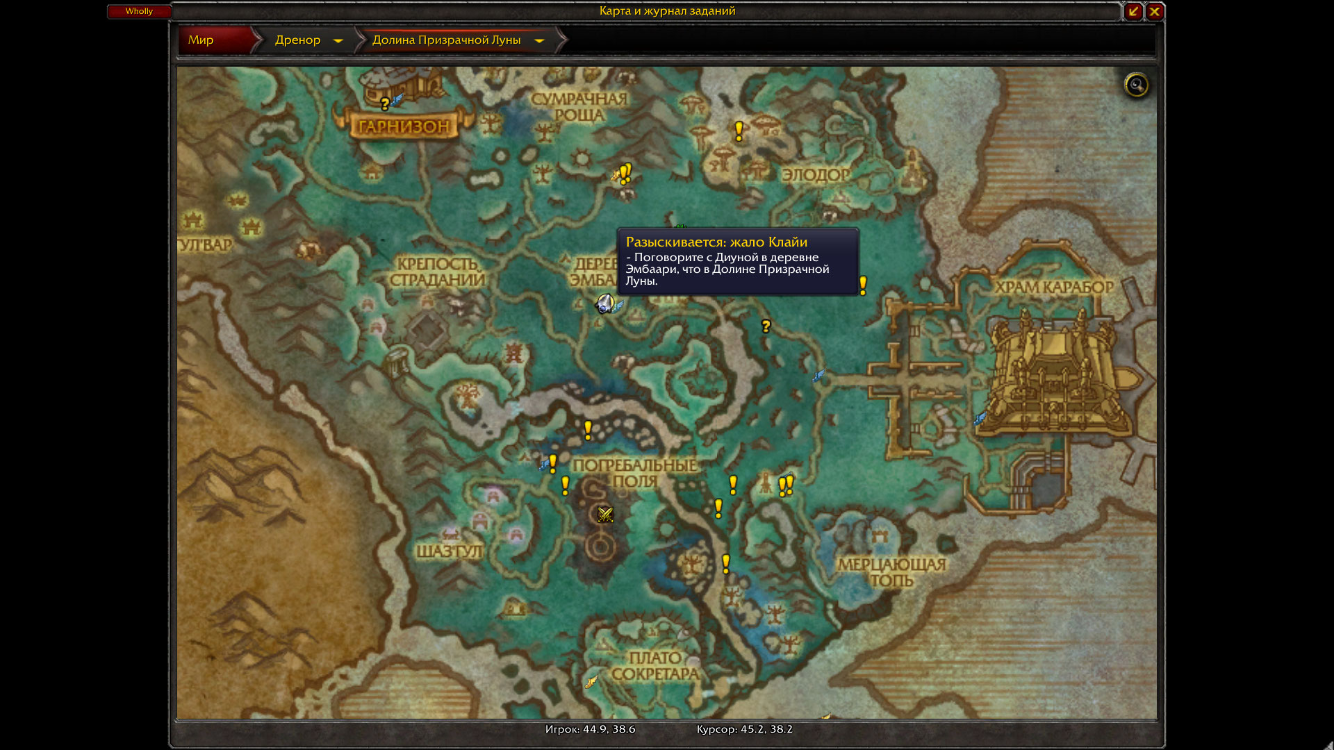 | Description | квест РАЗЫСКИВАЕТСЯ: жало Клайи https://ru.wowhead.com/quest=33834/%D1%80%D0%B0%D0%B7%D1%8B%D1%81%D0%BA%D0%B8%D0%B2%D0%B0%D0%B5%D1%82%D1%81%D1%8F-%D0%B6%D0%B0%D0%BB%D0%BE-%D0%BA%D0%BB%D0%B0%D0%B9%D0%B8 невозможно сдать квест тк требуемого нпс https://ru.wowhead.com/npc=81292/%D0%B4%D0%B8%D1%83%D0%BD%D0%B0 нет в указанной точке, там вообще никого нет | ||||