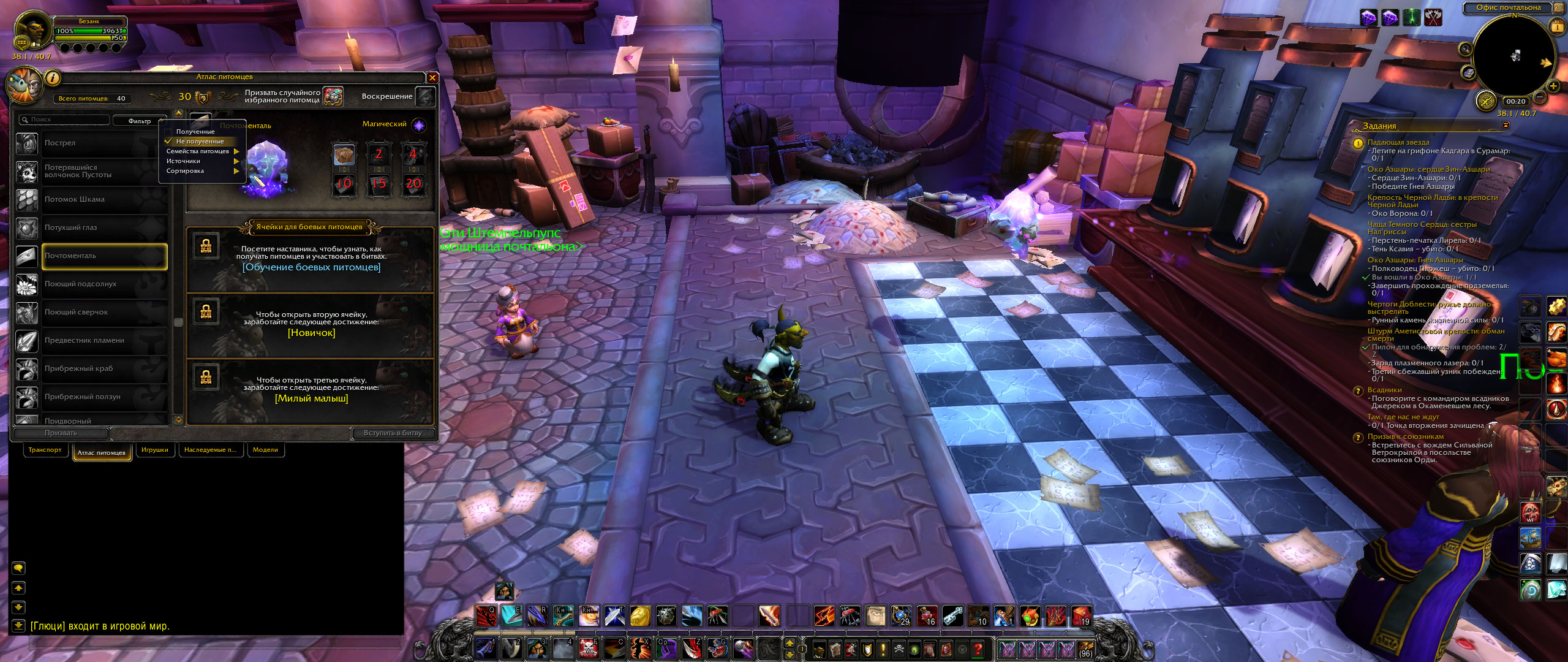 | Description | Пройдя цепочку квестов с https://ru.wowhead.com/quest=41368/%D1%83%D1%82%D0%B5%D1%80%D1%8F%D0%BD%D0%BD%D0%BE%D0%B5-%D0%BF%D0%B8%D1%81%D1%8C%D0%BC%D0%BE и рассортировав 30 писем получил достижение Срочная корреспонденция и звание почтальон, но не получил достижение Экспресс-доставка и пета https://ru.wowhead.com/item=156721/%D0%BF%D0%BE%D1%87%D1%82%D0%BE%D0%BC%D0%B5%D0%BD%D1%82%D0%B0%D0%BB%D1%8C#battle-pet | ||||