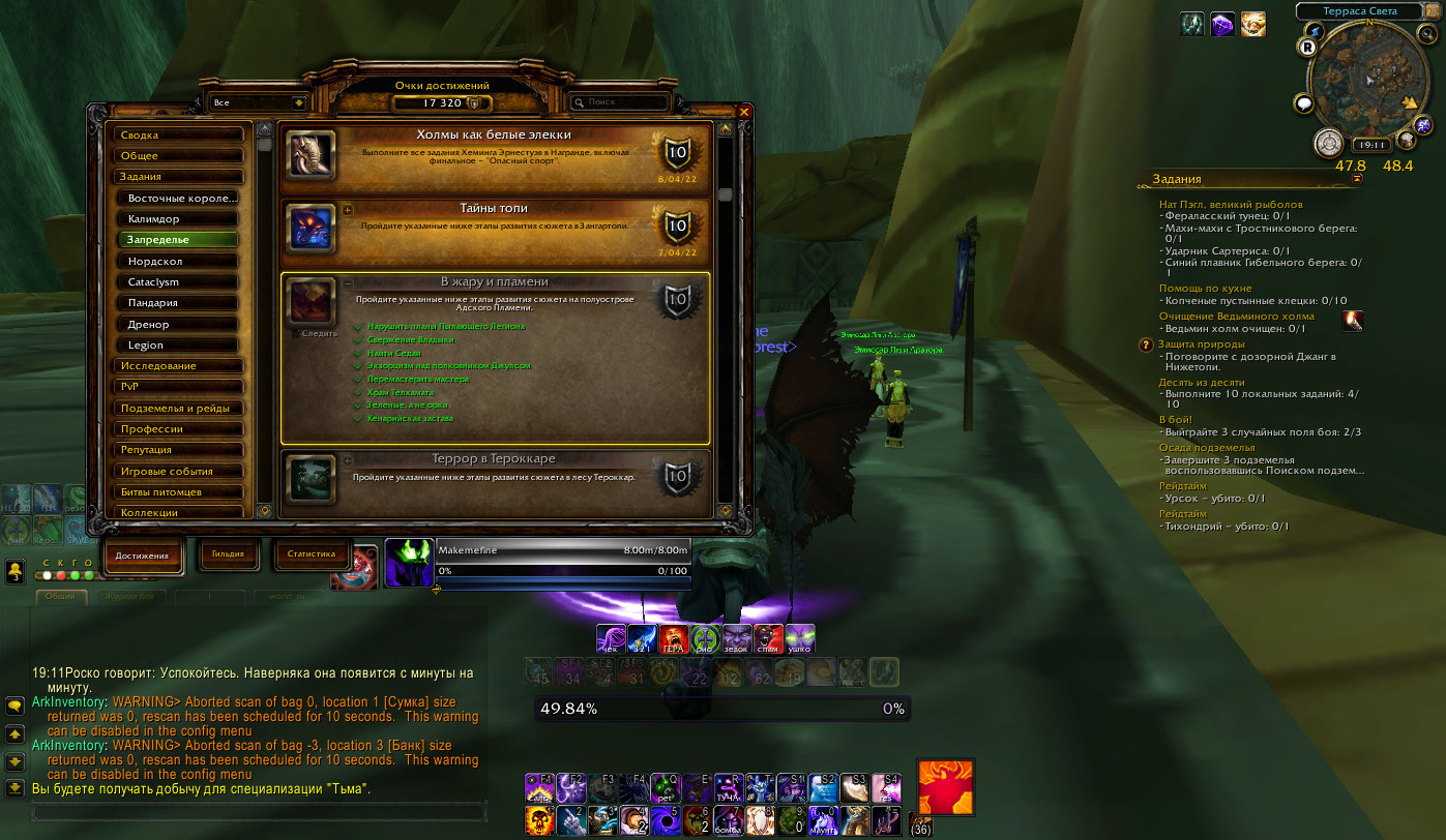 Запросил данные о вашем персонаже. Странно, но в базе нет записей о выполненных достижениях 1189 или 1271, хотя они должны там быть, если достижение было ранее получено. А вот записи о прогрессе есть. Для достижения в альянсе у вас не хватает выполненных заданий: 9351 и 9545. |