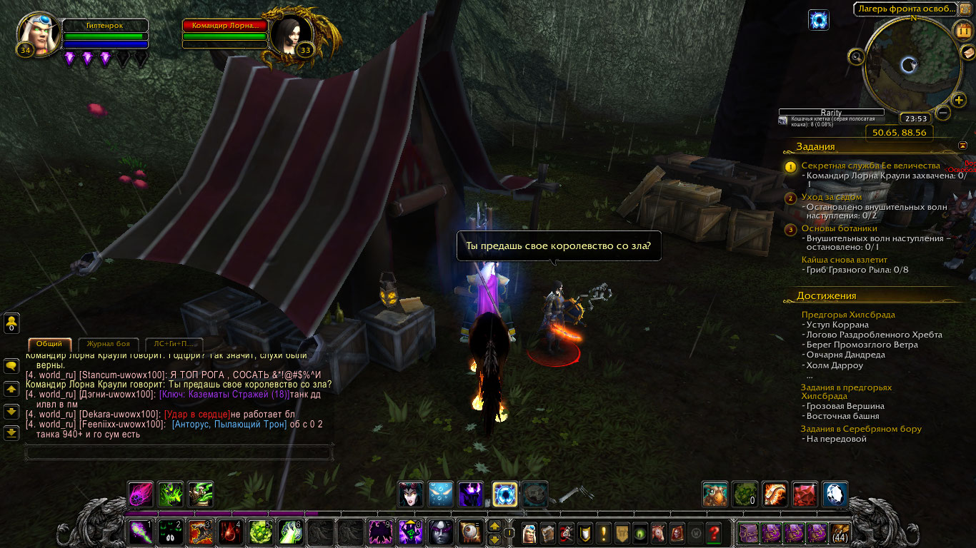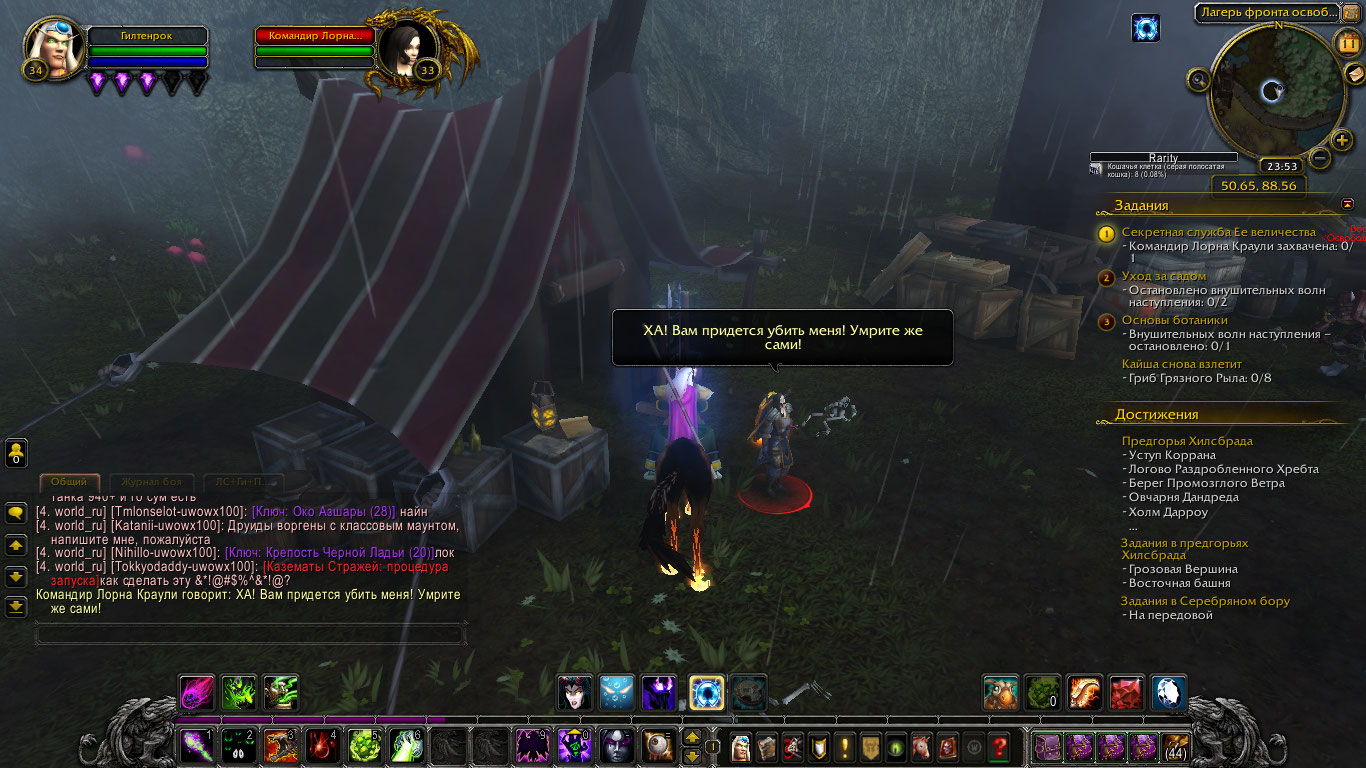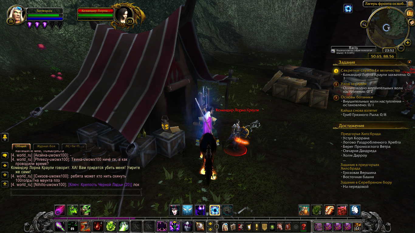 Так я не знаю почему....Но на сервере будто бы...все работает не совсем в том порядке как на wowhead. И странно отображает игра квесты на карте криво (я нашла кв посмотрев где он еще раз по аддону Quest Complist, он отображает где искать квест корректнее) ...Как выше видно https://ru.wowhead.com/quest=27550/гибель-погребальных-костров Отображало не там где я его нашла по итогу. Он не на передовой, а в деревне у Руин Гилнеаса.... Кстати, увы и эта цепочка багнута...Она закончилась у меня на квесте https://ru.wowhead.com/quest=27594/секретная-служба-ее-величества Проблема в нпс Лорна Краули, которую мы должны взять в плен (не активна для убийства) не береться в плен и говорит с воздухом 4 строчки диалога: 1-Так королева баньши послала убийц? 2-Годфри, так слухи верны? 3-Ты предаешь свое королевство злу? 4-Ха вам предеться меня убить! Умрите же сами! Почему я так описываю? Все говориться с задержкой. Видимо со мной должны быть нпс и они должны отвечать. Но при двух попытках отменить-взять кв заново Годфри и Эшли со мной не идут... По итогу Лорни говорит сама с собой и после фразы 4, повторяет диалог еще раз и еще...до бесконечности квест нереально завершить....Скрины с ее монологом прилагаю... Квест точно сломан или забагован по кругу. Выполнить цепочку опять невозможно без фиксов в бору. WoWScrnShot_041122_235256.jpg (287,724 bytes) WoWScrnShot_041122_235300.jpg (289,422 bytes) WoWScrnShot_041122_235304.jpg (292,341 bytes) WoWScrnShot_041122_235329.jpg (266,853 bytes) |
