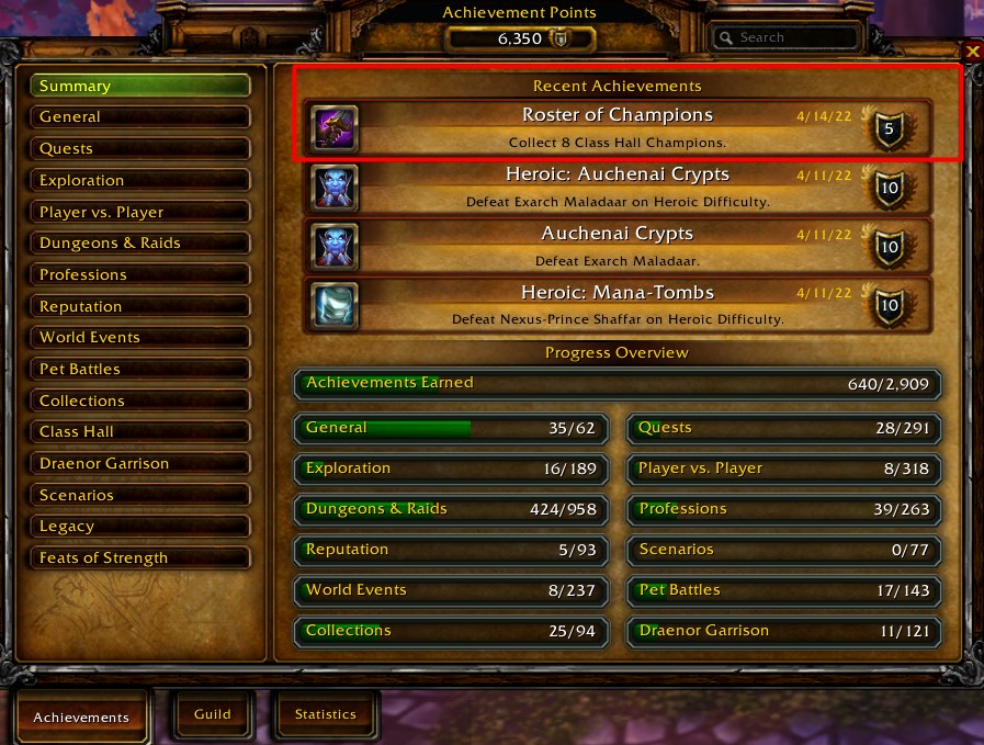 | Description | When you open the Achievements tab, every day you receive a "new" achievement. The achievement is named "Roster of Champions". It sits on the top of the recently earned achievements and the date is the current date of the day, in this case 14.04.22 as of writing this. | ||||