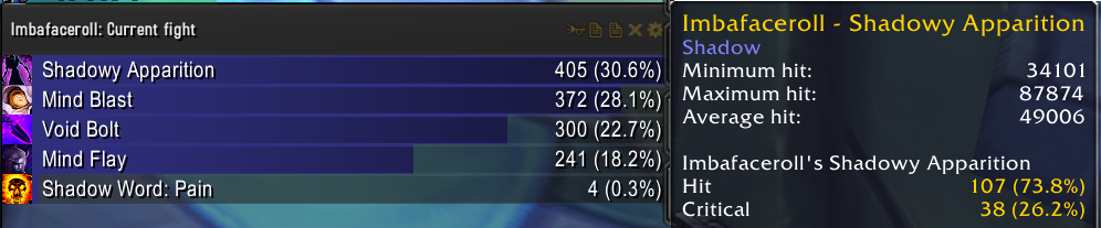 Shadowraze, потестите получше пожалуйста. Я каждый день замечаю это явление на обоих серверах(х5 и х100). Я нажимаю артефакт и 25% духов, которые вылетают, не дают 3% энергии. Могу демку в дискорде включить. Так же заметил, что у шп неправильно работает облик бездны(не так, как на оффе). Сейчас видео на варкрафт логс устарели, но год назад еще можно было посмотреть и увидеть что присты в облике бездны живут больше, чем тут. И это не от того, что они более рукастые или статы у них кривые. Это от того, что тут неправильно работает облик бездны. После примерно 27 стака безумие уходит в разы быстрее, чем на оффе. И так же % скорости прибавляются в разы меньше, чем на оффе. Тут шп, собранные в статы в 970 гире в соло цель дают 1,8кк дпс. На оффе они давали 2,5кк+ спокойно(это так же чекается по логам). Тут я в 970 гире фулл одетый в статы могу держать 50-60 стаков облика бездны, на оффе держали люди по 70-80(это очень значительные цифры). Тут прист очень сильно понерфлен. Я уверен, что я не первый об этом пишу на багтрекер и много людей вам уже говорило, что шп сломаны тут. Возможно это сделано потому что, шп в 7.3.5 - топ дпс практически везде и вы не хотели, чтобы тут был дисбаланс, нарошно сломали его и отнекиваетесь, говоря, что "у вас все работает". Опять же ни в чем никого не обвиняю, просто говорю, что вижу. |