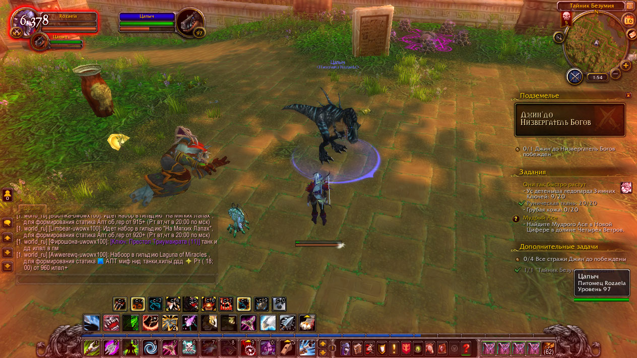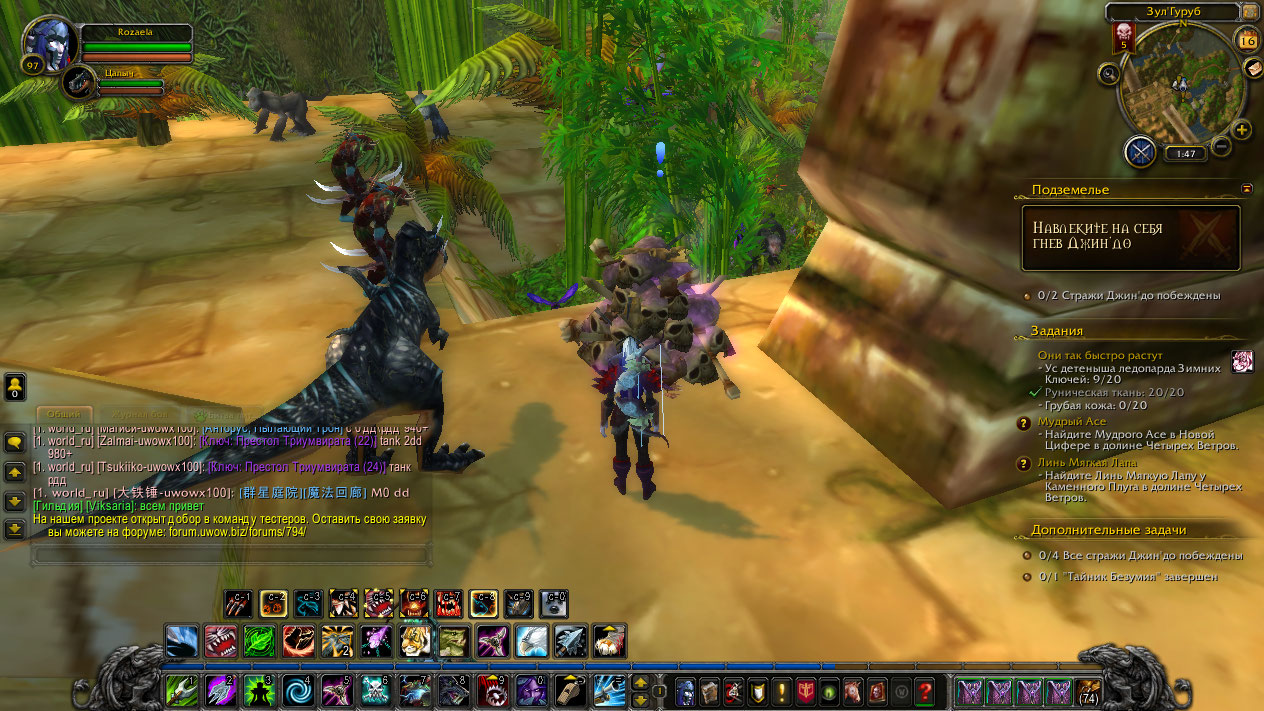 От Goodwinn 22.02.2015 (Обновление 6.0.3) If you have 425+ Archaeology skill you can click on the Voodoo Pile located at 31.5, 48.5 in Zul'Gurub. This will start the quest Zul'Gurub Voodoo which allows you to exchange a Troll Tablet for a zone-wide buff called Call o' da Raptor which causes a Young Gurubashi Raptor to sometimes come to your aid while in the dungeon. This buff is applied to all party members and will persist through death. New players joining a dungeon in-progress will also receive the buff if it was activated before they got there. Если квест на археологию не работает, вам нужно создать отдельный репорт и прикрепить к соответствующему разделу: "профессии" |