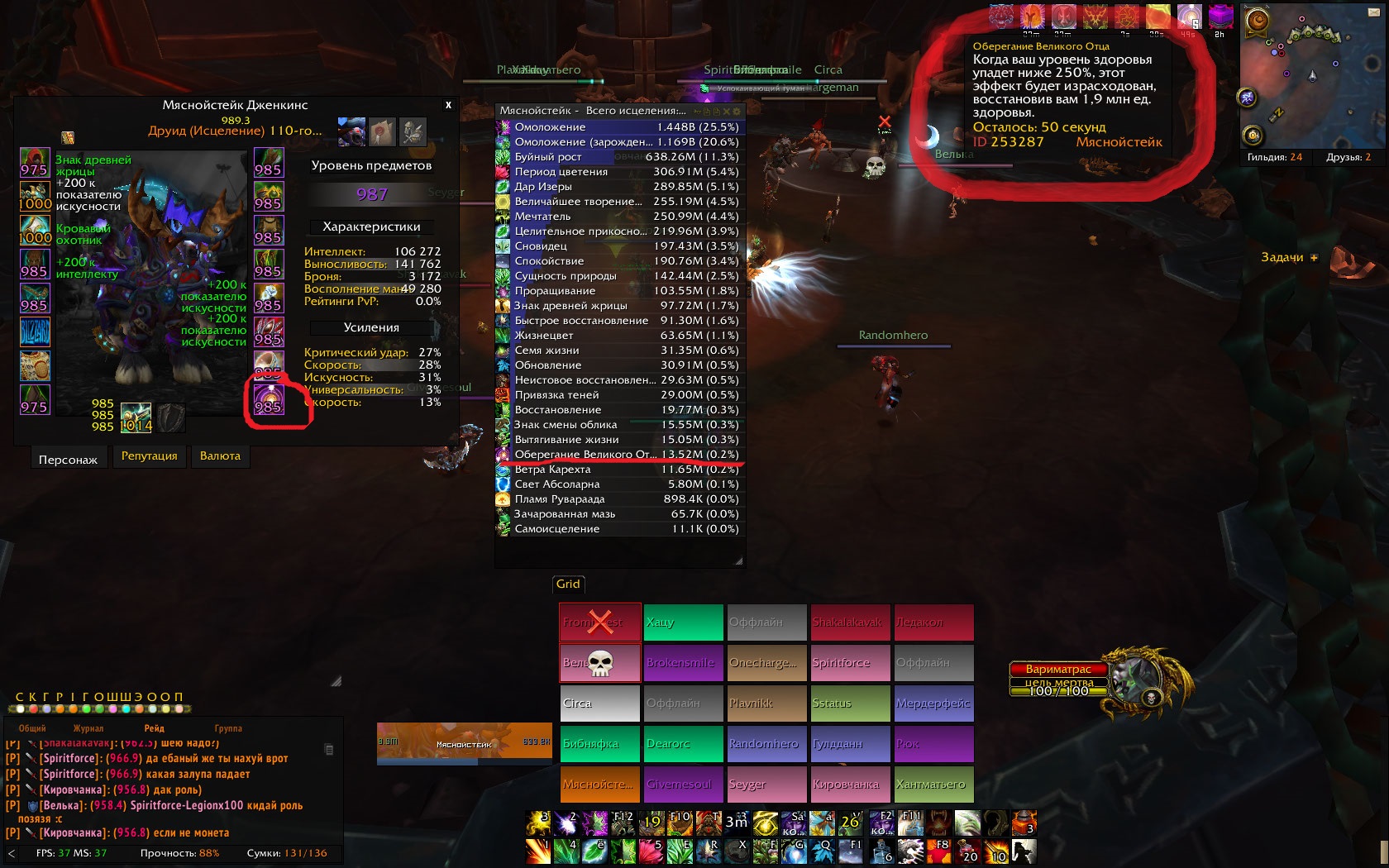Само срабатывание лечения от суммирующего эффекта. Вот предоставляю скрин , вчера закрывали уд 16й, хоты на персах поддерживал постоянно , это говорит о том что заряды эффекта "Оберегание Великого Отца" прокало постоянно на всех, но само лечение от него очень часто не проходило при просадке ниже 50%. У меня от 5 зарядов эффекта 2м восстановления здоровья, по скаде видно что восстановлено всего 8м (это говорит о том что мало срабатываний было, хотя от треша просадки были очень часто) ну это обычный кей который закрывается в 10-15 мин. А когда в 2 хила на 20человек идешь к примеру в АПТ героик и за фул пронос всего инста аксесуар нахиливает всего 0,2%( 12-15 миллионов) от общего отхила (который состовляет к примеру 4мм), это при том что всегда на всех висят мои хоты от которых прокает эффект "Оберегание Великого Отца", но при падении здоровья ниже 50% он очень плохо срабатывает и лечение от него не получают, и сам эффект висит 1 минуту в пустую это уже не серьезно. Раньше к аксессуару претензий не было, он работал как положено. Заходил в соло в ГС проверял аксессуар, эффекты лечения срабатывали как положено, в дуэлях тоже срабатывает как положено , но когда находишься в рейдах и этот эффект висит на других персонажах, с срабатыванием лечения от эффекта начинаются какие-то проблемы.