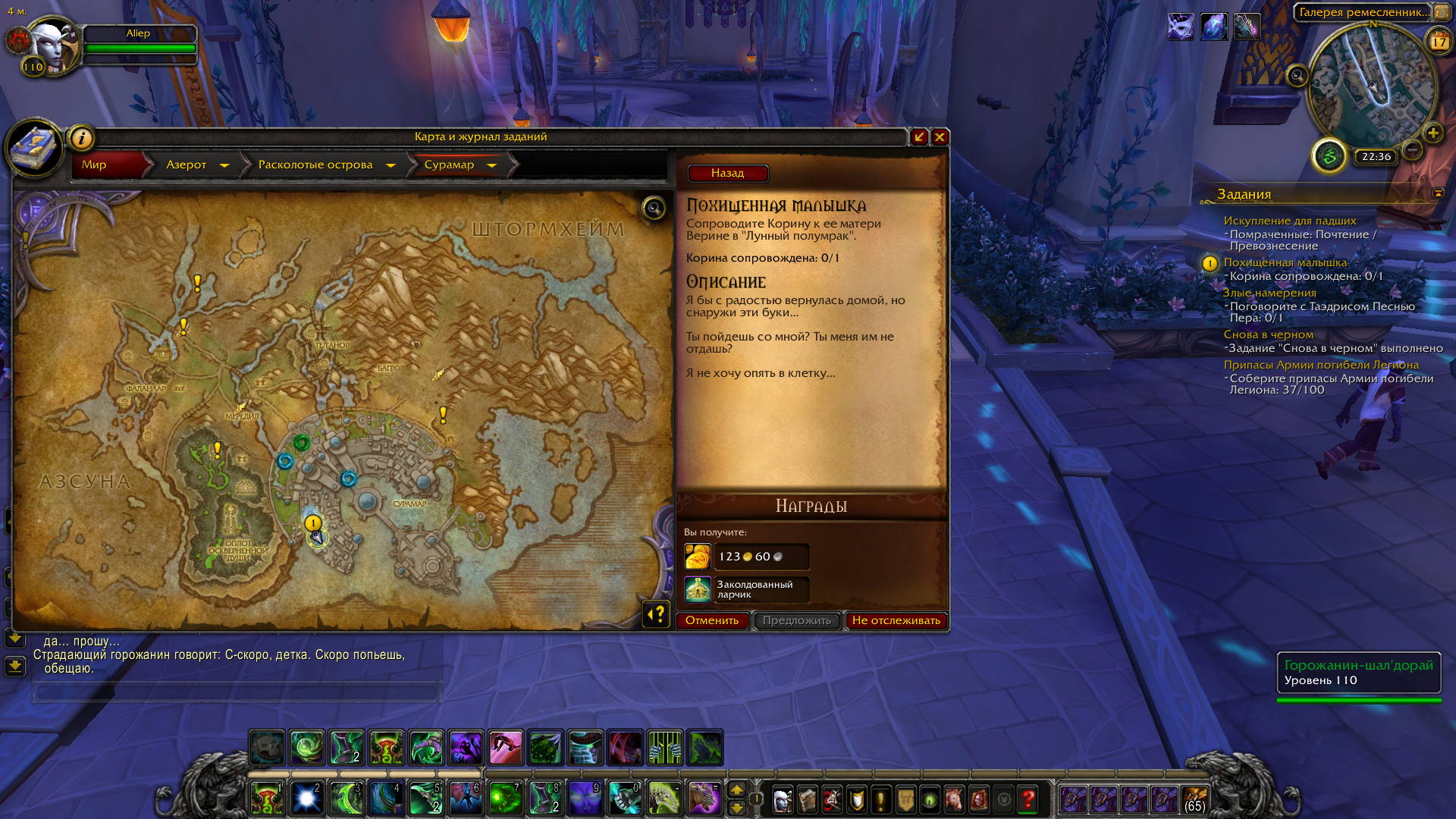 Добрый день! Благодарю за сообщение. отмените задание и возьмите снова там где брали https://ru.wowhead.com/quest=42486 Проверял работу данного задания https://youtu.be/sew296LcXuM можете посмотреть видео. Обратите внимание, что на каждом мосту Вам необходимо отбиваться от НПС. Ранее уже исправляли это задание http://tracker.legionbugs.com/view.php?id=5749 Сообщите получилось ли у Вас пройти задание. на данный момент ошибок я не нашел. |