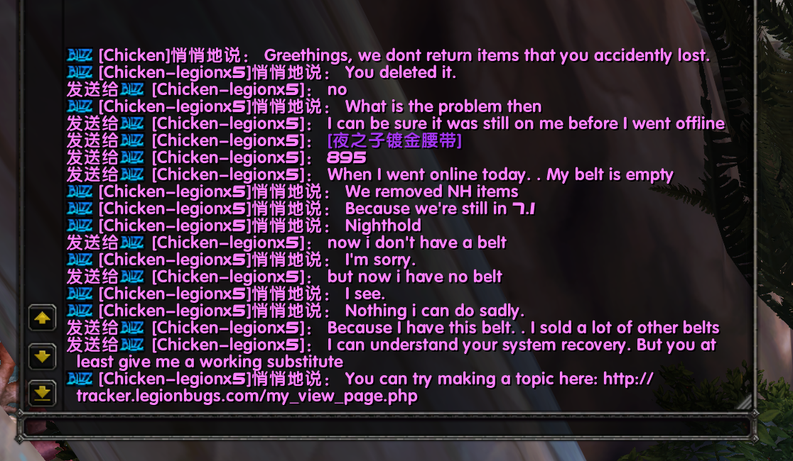 | Description | When I went offline yesterday, my belt (a belt with item level 895 crit and mastery) was still there, but when I went online today, my belt was gone, I found the GM (Chicken), and he told me that the system deleted me belt, but I don't have one anymore. I can't do Raid activities normally, can you give me at least one belt of the same outfit? | ||||