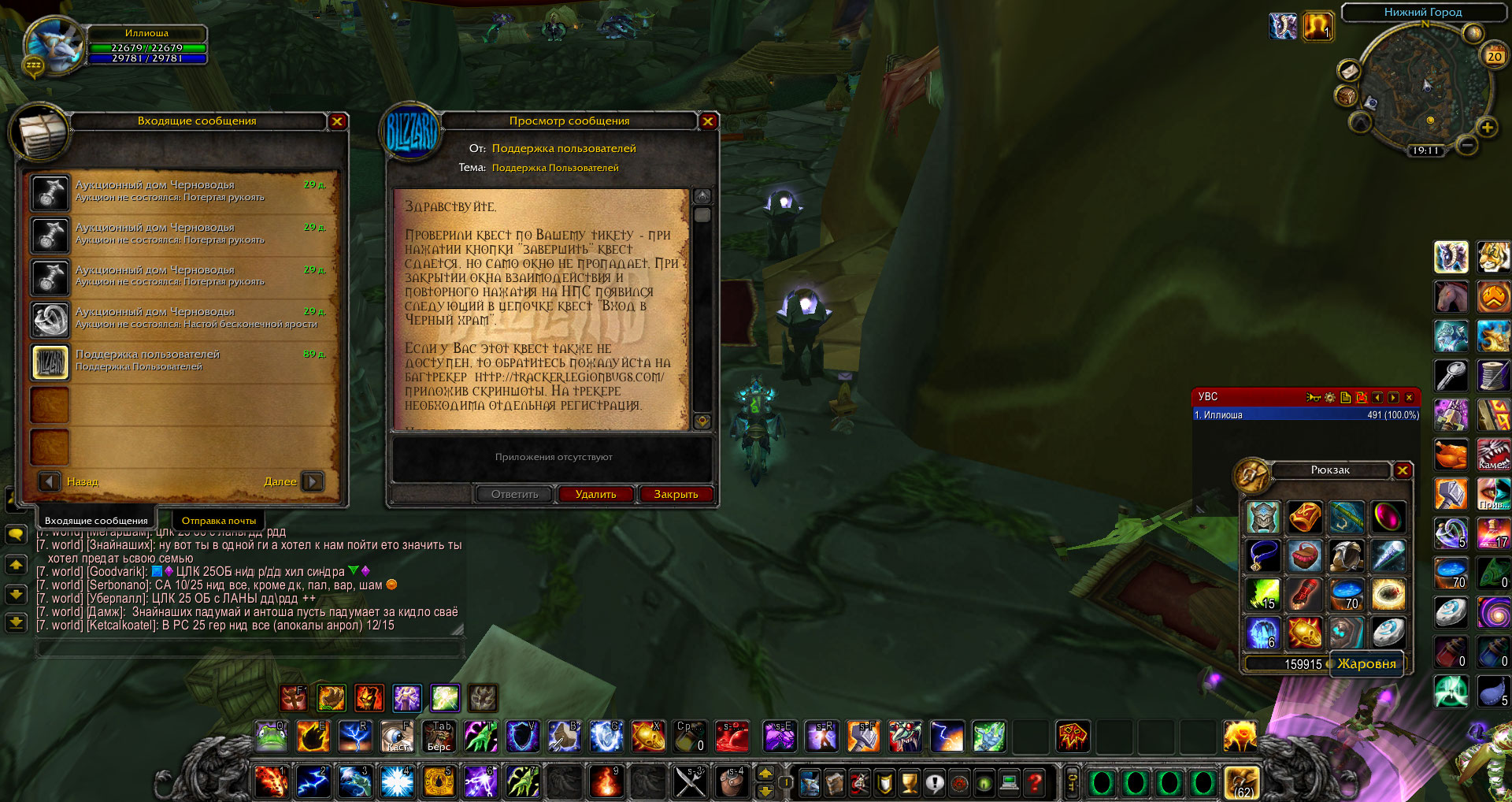 | Description | Выполнял цепочку квестов на получение достижения "длань а дала", при выполнении квеста "пленная душа" не нажималась кнопка "завершить" у НПС "А'дал". Попробовав нажать кнопку "завершить" несколько раз - я нажал крестик, подумав "ну должен выполниться, может глюк, если что возьму этот квест заново у Акамы. Но А дал не предложил следующий квест по цепочке "Вход в черный храм", и Акама не предложил взять тот проблемный квест "пленная душа". И выполнение данного ачива для меня стало невозможным, выполненный квест якобы уже сделан, а новый по цепочек не дают. Я написал в игре в техподдержку по этому вопросу, ответ ГМов во вложении (у них кнопка завершить тоже не прожимается, но при нажатии крестик новый квест дается..." 3.3.5 х30 Unique World, орда, Иллиоша. Скрины во вложении. | ||||