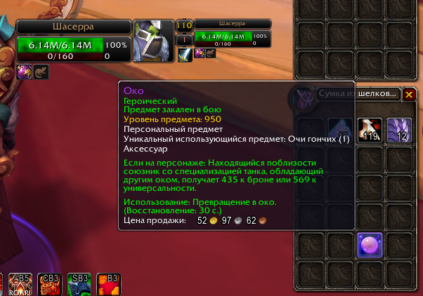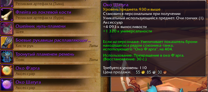 | Description | С сундука за "Посланник войны" ( https://ru.wowhead.com/quest=44171/%D0%BF%D0%BE%D1%81%D0%BB%D0%B0%D0%BD%D0%BD%D0%B8%D0%BA-%D0%B2%D0%BE%D0%B9%D0%BD%D1%8B ) упал тринкет "Око" ( https://ru.wowhead.com/item=152645/%D0%BE%D0%BA%D0%BE-%D1%88%D0%B0%D1%82%D1%83%D0%B3%D0%B0&bonus=3610:1472#dropped-by ). Тринкет не дает статы, как должен, не прожимается и даже не указан в лут листе. Как должно работать- учитывая все проблемы с данным аксессуаром, помимо юзабельности и смены "режима"- должен давать как минимум статы соответствующие своему итем-левелу. 1 https://ru.wowhead.com/item=153544/%D0%BE%D0%BA%D0%BE-%D1%84%D0%B0%D1%80%D0%B3%D0%B0&bonus=3610:1472 Не меняется при использовании на https://ru.wowhead.com/item=152645/%D0%BE%D0%BA%D0%BE-%D1%88%D0%B0%D1%82%D1%83%D0%B3%D0%B0&bonus=3610:1472. 2 https://ru.wowhead.com/item=153544/%D0%BE%D0%BA%D0%BE-%D1%84%D0%B0%D1%80%D0%B3%D0%B0&bonus=3610:1472 Не даёт бонус брони. 3 https://ru.wowhead.com/item=152645/%D0%BE%D0%BA%D0%BE-%D1%88%D0%B0%D1%82%D1%83%D0%B3%D0%B0&bonus=3610:1472. Так же не меняется при использовании на https://ru.wowhead.com/item=153544/%D0%BE%D0%BA%D0%BE-%D1%84%D0%B0%D1%80%D0%B3%D0%B0&bonus=3610:1472 4 При наличии у 2х танков в рейде двух этих тринкетов (Шатуга и фаргата) Они не дают дополнительных бонусов Брони-Универсальности | ||||