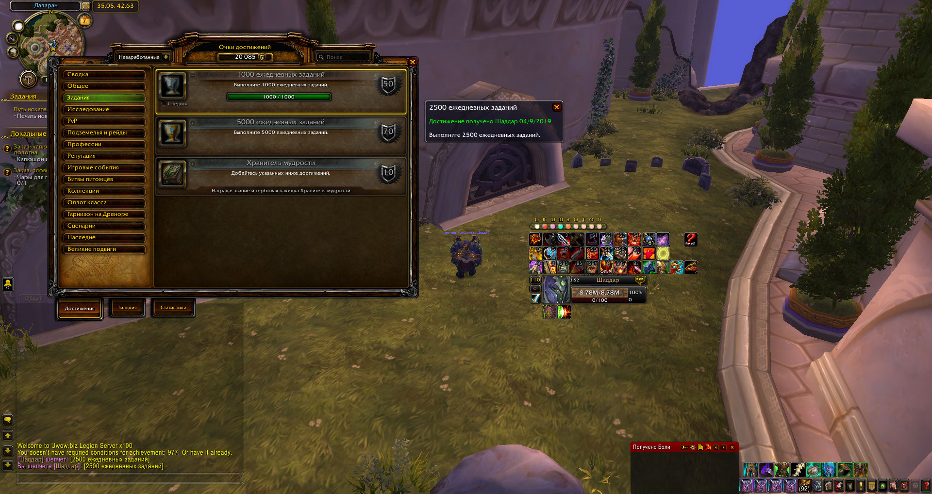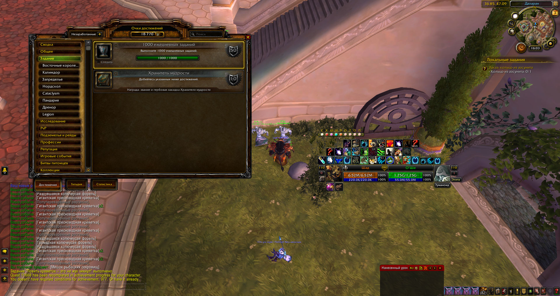 | Description | 1. https://ru.wowhead.com/achievement=977 2. Не засчитывается при выполнении условия. Пробовал перезасчитать у О'Ши как по квесту, так и по ачиву. Сделал 1000 дэйликов на другом персе - результат тот же. | ||||