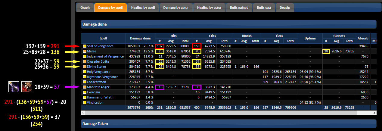 Вот скриншот логов с оффы времён ЛК (ЦЛК 25 Об , ссылку на сам лог не могу скинуть, так как сам сайт уже не поддерживается около года. Скрин делал в прошлом году, отправлял товарищу когда спорили по поводу паладинов. Оригинальная ссылка из переписки: http://www.worldoflogs.com/reports/rt-neryye5r3yaqn3fo/details/7/?s=3955&e=4260 Объяснения: - Первый расчёт: сума всех физических источников урона, включая https://ru.wowhead.com/spell=71433/несдерживаемый-гнев равняется 311 при 291 ударов от https://ru.tbc.wowhead.com/spell=31801/печать-мщения. Источников срабатывания больше чем количество ударов от печати - это корректно, так как печать не начнёт наносить урон пока не будет 5-и стаков на цели. То есть от 20 отнимаем первые 5-ть, другие же 15 лишних ударов/физ.способностей паладин мог совершить когда менял цель и переключался на треш с орка. - Второй расчёт: Если не учитывать 57 ударов от прока https://ru.wowhead.com/spell=71433/несдерживаемый-гнев , то получается, что количество ударов от печати превышает количество возможных источников срабатывания 291-254=37 на 37, что попросту не возможно по логике. Вывод: https://ru.wowhead.com/spell=71433/несдерживаемый-гнев является физическим типом урона, и https://ru.tbc.wowhead.com/spell=31801/печать-мщения должна срабатывать от него. |