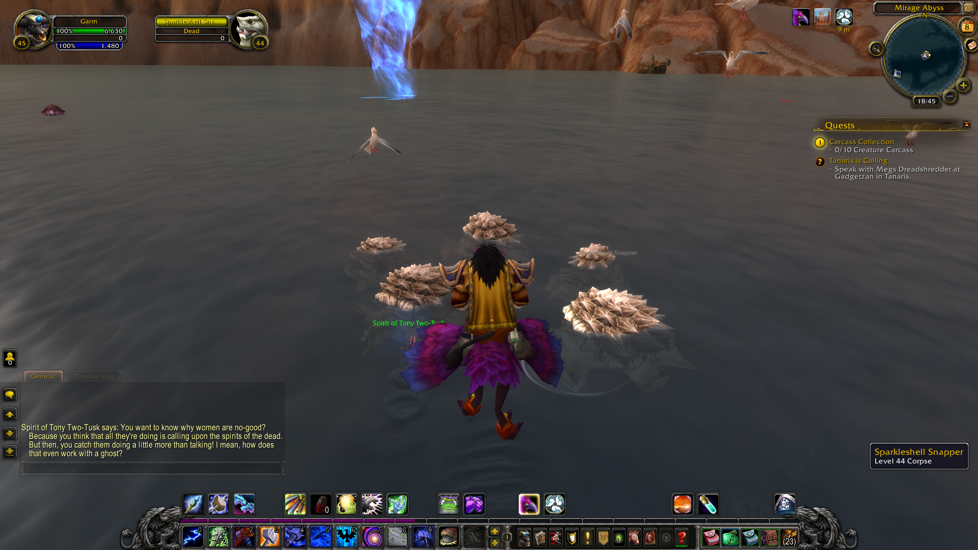 Thanks, I'll pass it on to the developer. However, you can complete this quest by collecting the quest item https://ru.wowhead.com/item=55226/ of other animals, whose corpses lie at the bottom. (Screenshot with place: https://ibb.co/k62tsgs) |