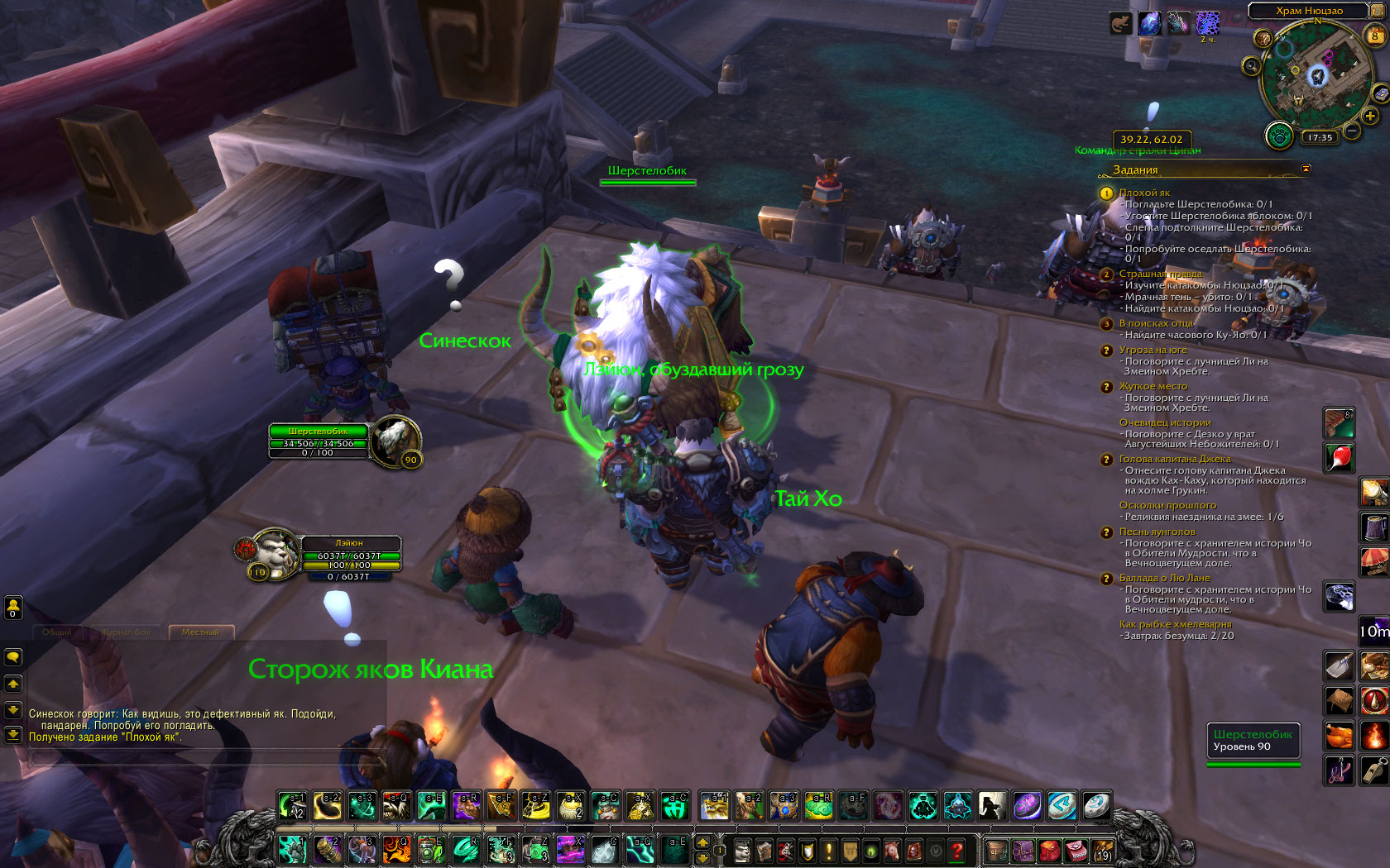 | Description | Невозможно погладить https://ru.wowhead.com/npc=61163/шерстелобик при выполнении квеста https://ru.wowhead.com/quest=30929/плохой-як , в связи с чем квест выполнить невозможно. Прикладываю скриншот со взаимодействием с яком. Видеоролик работающего квеста: https://www.youtube.com/watch?v=H8r1c30BW5s | ||||