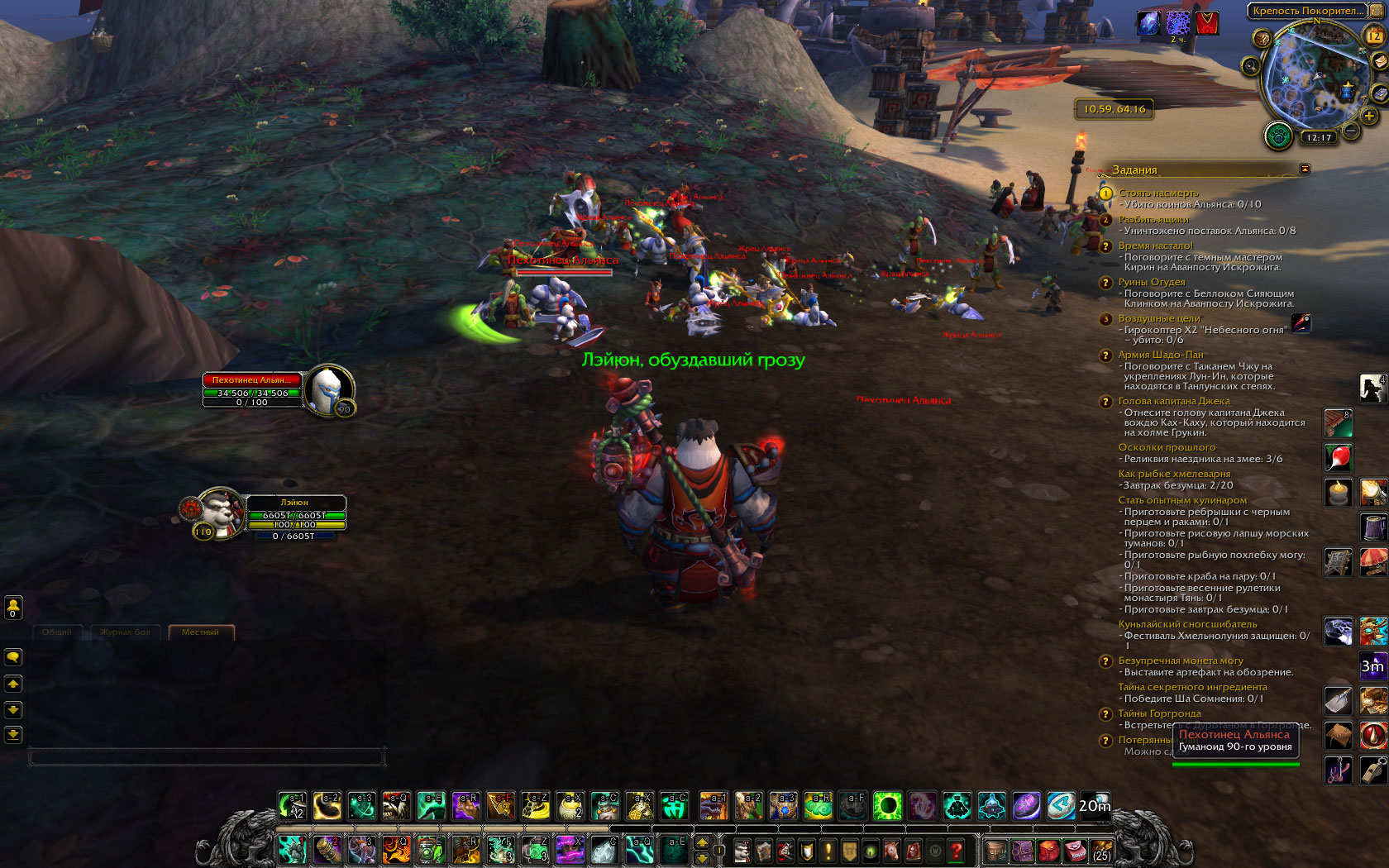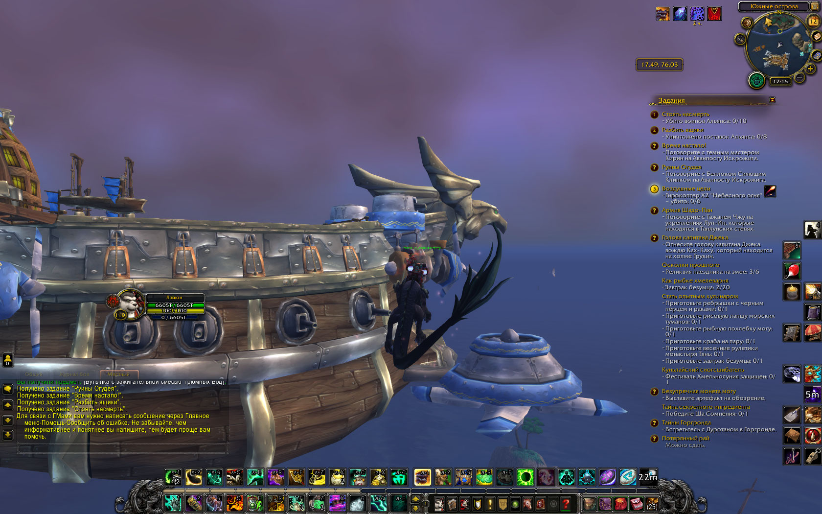 | Description | Следующие квесты, которые можно взять в Крепости Покорителей, выполнить невозможно: 1. https://ru.wowhead.com/quest=32235/воздушные-цели - отсутствуют гирокоптеры (1, 2 скриншоты); по совету комментаторов на Wowhead облетел воздушный корабль Альянса, однако и там их нет. 2. https://ru.wowhead.com/quest=32123/стоять-насмерть - (3-й скриншот) войска Альянса есть, однако они не отмечены для квеста, и их убийство в счёт не идёт. Найти их можно повсюду. | ||||