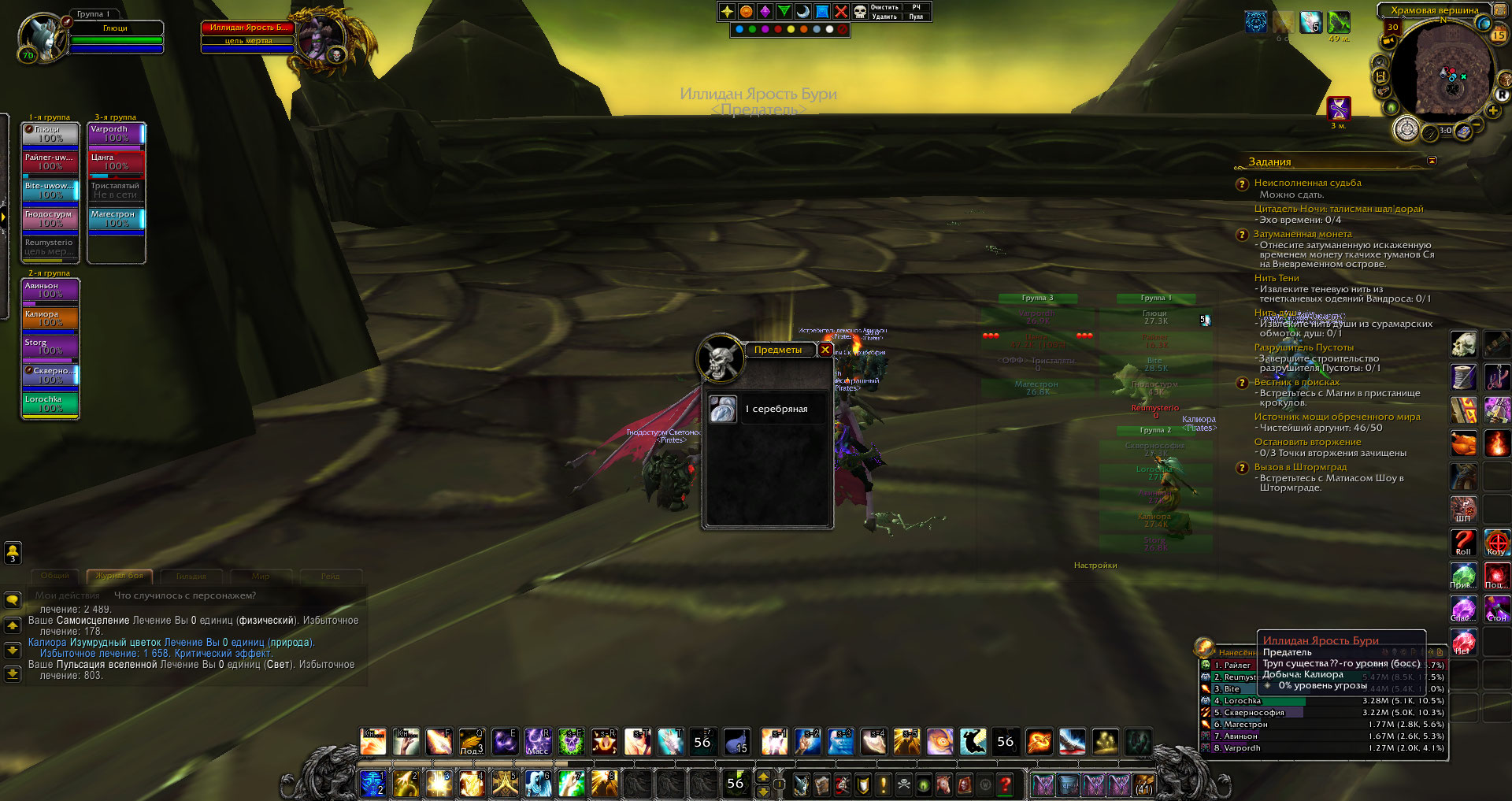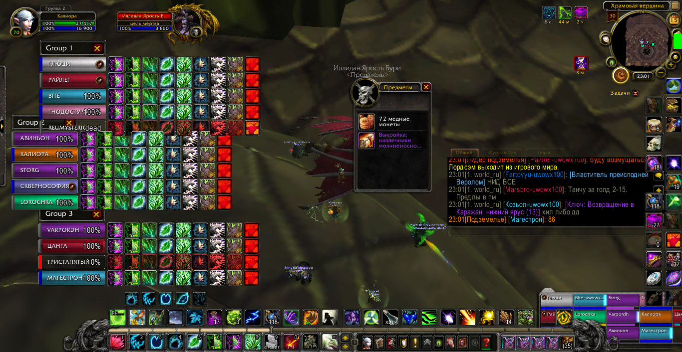 До самого конца рейда ни одному человеку не выпало ни одной вещи. К тому же, в бою с Илиданом пришлось использовать пляски с бубном и кайтить боса по всей арене, так как лучь был под ним и шотал всех подходящих к нему. К тому же, во время боя, периодически, наносился физический урон от демонического огня весь бой unknown.png.url (114 bytes) |