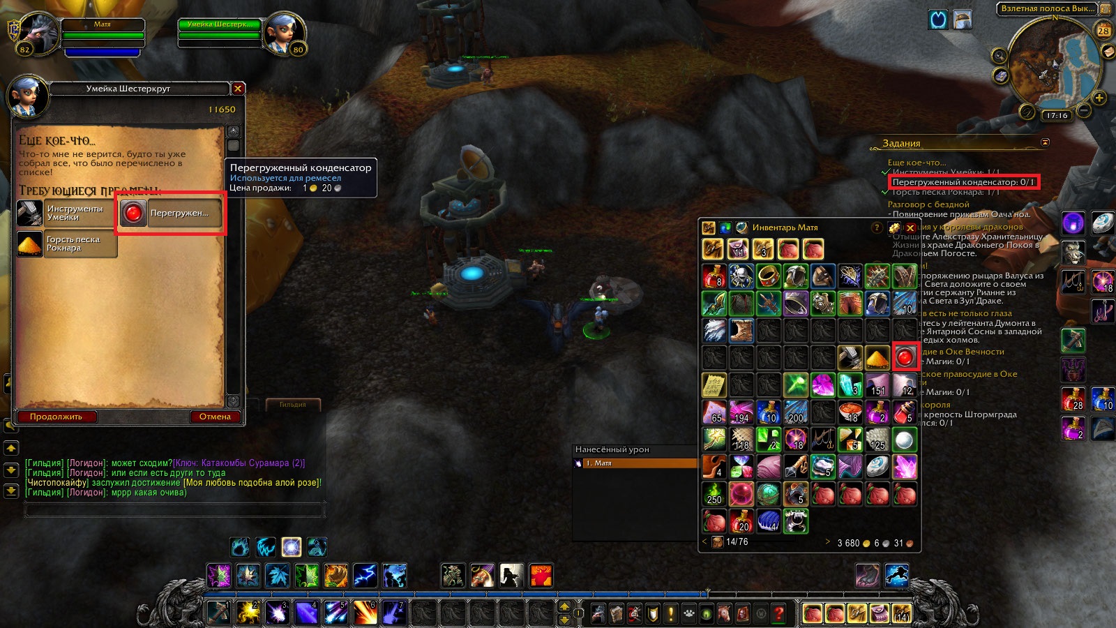 Не засчитывает наличие "Перегруженного конденсатора" в инвентаре. Прикладываю скриншот. WoWScrnShot_052822_201619.jpg (542,141 bytes) |