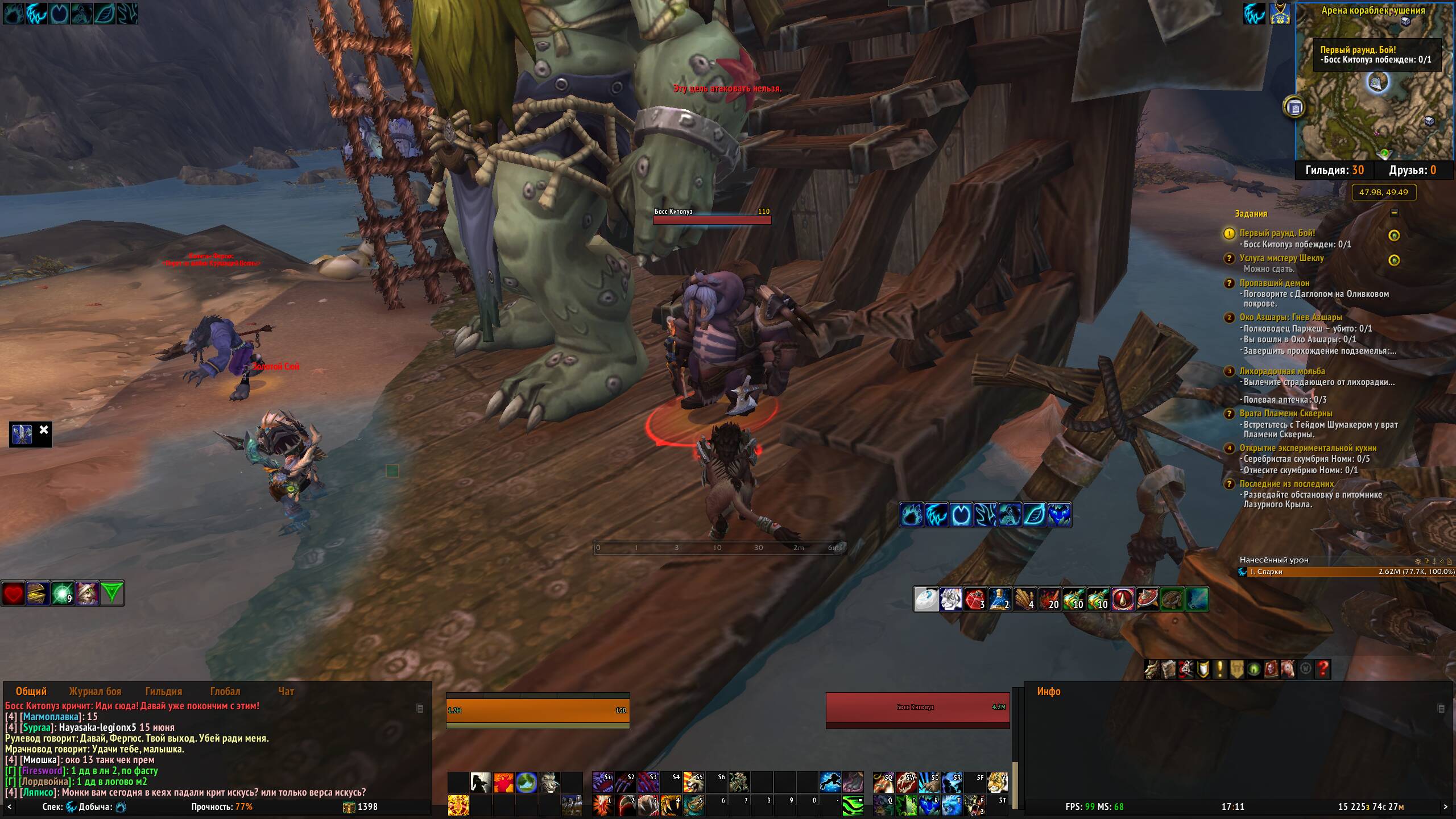 | Additional Information | ffcrash 1. задание https://ru.wowhead.com/quest=37538 1.1 Скрипт эвента: 00:00:00 принимаем задание, НПС https://ru.wowhead.com/npc=89048 говорит "Ну что, готов к выходу на арену?" 00:00:01 жмем диалог у НПС https://ru.wowhead.com/npc=89048 "Они готовы, Мрачновод. Бросай меня в бой" 00:00:03 НПС https://ru.wowhead.com/npc=89048 поднял игрока, засчитался критерий "Вас бросили на арену" 00:00:06 НПС https://ru.wowhead.com/npc=89048 говорит "Надеюсь, команда Мрачновода сможет гордиться тобой." 00:00:06 НПС https://ru.wowhead.com/npc=89048 бросил игрока 00:00:07 игрок приземлился в координаты Map: 1220 (Broken Isles) Zone: 7334 (Azsuna) Area: 7344 (Shipwreck Arena) WMOAreaId: 82623 Phase: 1 X: -332.079987 Y: 6673.569824 Z: 4.809740 Orientation: 4.105120 00:00:07 НПС https://ru.wowhead.com/npc=89050 говорит "//имя игрока// Ха! Ты последний из гладиаторов Мрачновода." 00:00:14 НПС https://ru.wowhead.com/npc=89050 говорит "Иди сюда! Давай уже покончим с этим!" 00:00:17 НПС https://ru.wowhead.com/npc=89072 говорит "Давай, Фергюс. Твой выход. Убей ради меня" 00:00:17 НПС https://ru.wowhead.com/npc=89048 говорит "Удачи тебе, малыш." 00:00:20 НПС https://ru.wowhead.com/npc=89072 хватает НПС https://ru.wowhead.com/npc=89056 00:00:24 НПС https://ru.wowhead.com/npc=89072 бросает НПС https://ru.wowhead.com/npc=89056 00:00:25 НПС https://ru.wowhead.com/npc=89056 приземляется в координаты Map: 1220 (Broken Isles) Zone: 7334 (Azsuna) Area: 7344 (Shipwreck Arena) WMOAreaId: 82627 Phase: 1 X: -371.665070 Y: 6659.411621 Z: 1.463105 Orientation: 0.029969 00:00:26 НПС https://ru.wowhead.com/npc=89056 атакует игрока 00:00:26 НПС https://ru.wowhead.com/npc=89056 говорит "Ну что, пора умирать, //раса игрока, например орк//?" / на 50% использует https://ru.wowhead.com/spell=41057 после использует https://ru.wowhead.com/spell=129206/ 00:00:27 убиваем НПС https://ru.wowhead.com/npc=8905 00:00:27 НПС https://ru.wowhead.com/npc=89048 говорит "Отличный бой, //имя игрока//! Осталось всего два бойца." 00:00:30 НПС https://ru.wowhead.com/npc=89072 хватает НПС https://ru.wowhead.com/npc=88932 00:00:33 НПС https://ru.wowhead.com/npc=89072 бросает НПС https://ru.wowhead.com/npc=88932 00:00:33 НПС https://ru.wowhead.com/npc=88932 говорит "Да пребудет с тобой благословение Нефритовой Змеи!" 00:00:34 НПС https://ru.wowhead.com/npc=88932 приземляется в координаты Map: 1220 (Broken Isles) Zone: 7334 (Azsuna) Area: 7344 (Shipwreck Arena) WMOAreaId: 82627 Phase: 1 X: -371.665070 Y: 6659.411621 Z: 1.463105 Orientation: 0.029969 00:00:34 НПС https://ru.wowhead.com/npc=89072 говорит "Не подведи меня, рыбочеловек, не то насажу тебя на крючок вместо наживки." 00:00:35 НПС https://ru.wowhead.com/npc=88932 атакует игрока 00:00:35 НПС https://ru.wowhead.com/npc=88932 говорит "Ты все равно проиграешь." 00:00:35 НПС https://ru.wowhead.com/npc=88932 кастует https://ru.wowhead.com/spell=79831/ потом на себя https://ru.wowhead.com/spell=6434/ на 80% кастует https://ru.wowhead.com/spell=37054/ на 60% https://ru.wowhead.com/spell=79831/ потом на себя https://ru.wowhead.com/spell=6434/ на 40% https://ru.wowhead.com/spell=79831/ потом https://ru.wowhead.com/spell=37054/ на 10% https://ru.wowhead.com/spell=79831/ потом на себя https://ru.wowhead.com/spell=6434/ 00:00:45 убиваем НПС https://ru.wowhead.com/npc=88932 00:00:45 НПС https://ru.wowhead.com/npc=89072 говорит "НЕ-Е-Е-Т!" 00:00:45 НПС https://ru.wowhead.com/npc=89048 говорит "Да!" 00:00:49 НПС https://ru.wowhead.com/npc=89072 хватает НПС https://ru.wowhead.com/npc=89050 00:00:50 НПС https://ru.wowhead.com/npc=89050 говорит "Ну же, Рулевод. Пора уже и меня выпускать!" 00:00:53 НПС https://ru.wowhead.com/npc=89072 бросает НПС https://ru.wowhead.com/npc=89050 00:00:53 НПС https://ru.wowhead.com/npc=89072 говорит "Покончи с этим, Китопуз!" 00:00:54 НПС https://ru.wowhead.com/npc=89050 приземляется в координаты Map: 1220 (Broken Isles) Zone: 7334 (Azsuna) Area: 7344 (Shipwreck Arena) WMOAreaId: 82627 Phase: 1 X: -371.665070 Y: 6659.411621 Z: 1.463105 Orientation: 0.029969 00:00:54 НПС https://ru.wowhead.com/npc=89050 говорит "Я же сказал, что покромсаю тебя в мелкие кусочки, //имя игрока//." 00:00:56 НПС https://ru.wowhead.com/npc=89050 атакует игрока 00:00:56 НПС https://ru.wowhead.com/npc=89050 говорит "Именно это я и собираюсь сделать!" на 60% кастует https://ru.wowhead.com/spell=182728 потом https://ru.wowhead.com/spell=182701/ на 30% говорит "Ни шагу назад!" 00:01:05 убиваем НПС https://ru.wowhead.com/npc=89050 00:01:05 НПС https://ru.wowhead.com/npc=89050 говорит "ЧТО?! Нет..." 00:01:07 НПС https://ru.wowhead.com/npc=89048 говорит "Невероятное представление, //имя игрока//. А теперь иди, найди 