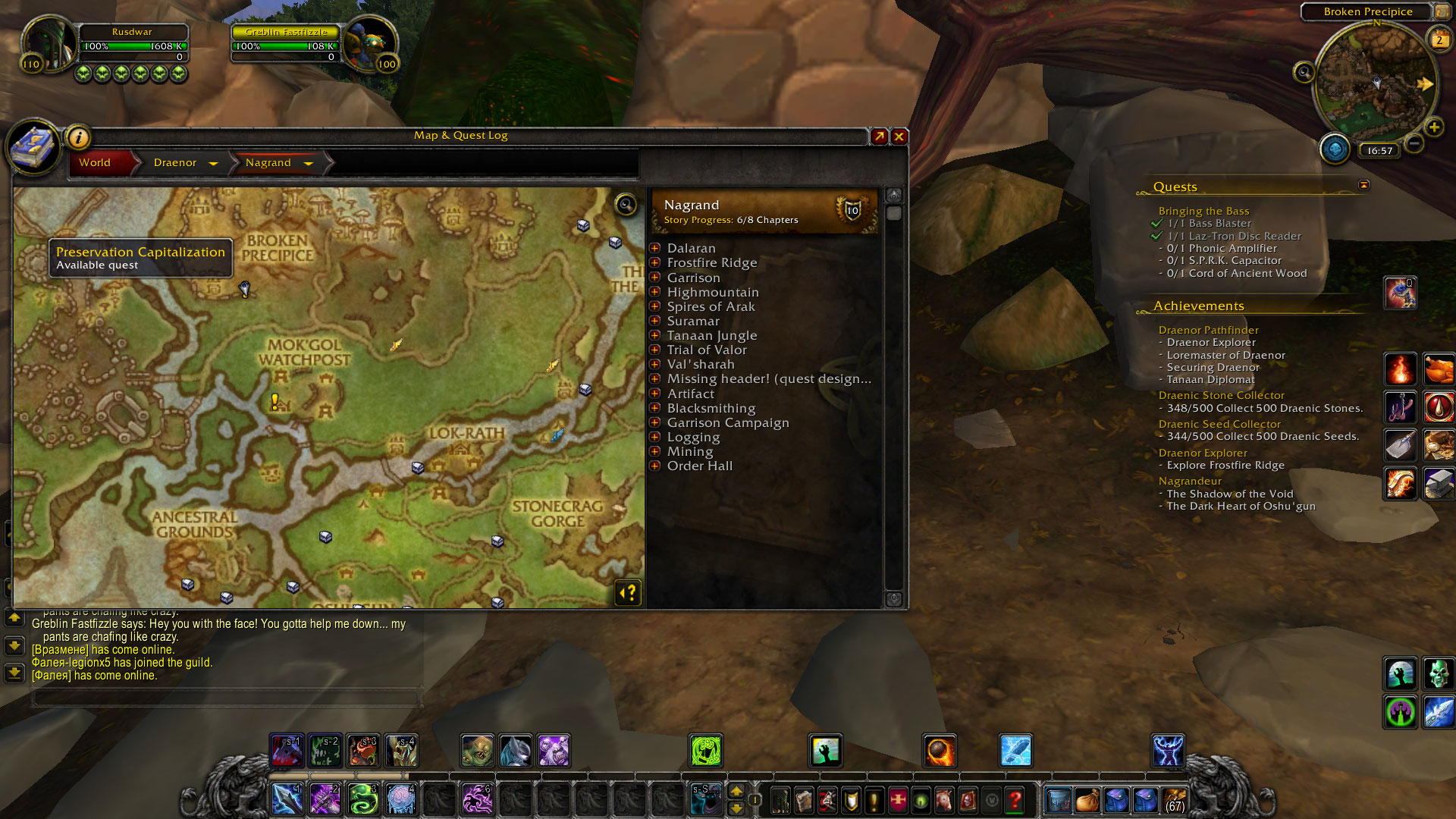 | Description | It looks like that quest https://www.wowhead.com/quest=35945/greblin-fastfizzle doesn't exist. The NPC https://www.wowhead.com/npc=83686/greblin-fastfizzle is there, but doesn't appear to be a quest-giver. In addition, the map shows https://www.wowhead.com/quest=35970/preservation-capitalization as the available quest there instead, but again - https://www.wowhead.com/npc=83686/greblin-fastfizzle doesn't work as a quest giver for it either. | ||||