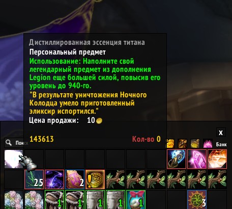 | Description | Предмет, используемый для улучшения легендарных предметов с 910 до 940 серого качества и продается вендору. Я получил его полторы недели назад. Сегодня, сдав второй квест, решил улучшить 2 легендарки сразу и выяснилось, что он был продан вендору ошибочно. На версии 7.1.5, о которой заявлено, предмет был легендарного качества и никак не мог быть продан вендору, поэтому требую вернуть мне предмет и изменить его качество на легендарное. На скриншотах серый - наш сервер, легендарный - с ролика, вышедшего после введения этого квеста на официальном сервере, что подтверждает мои слова. | ||||