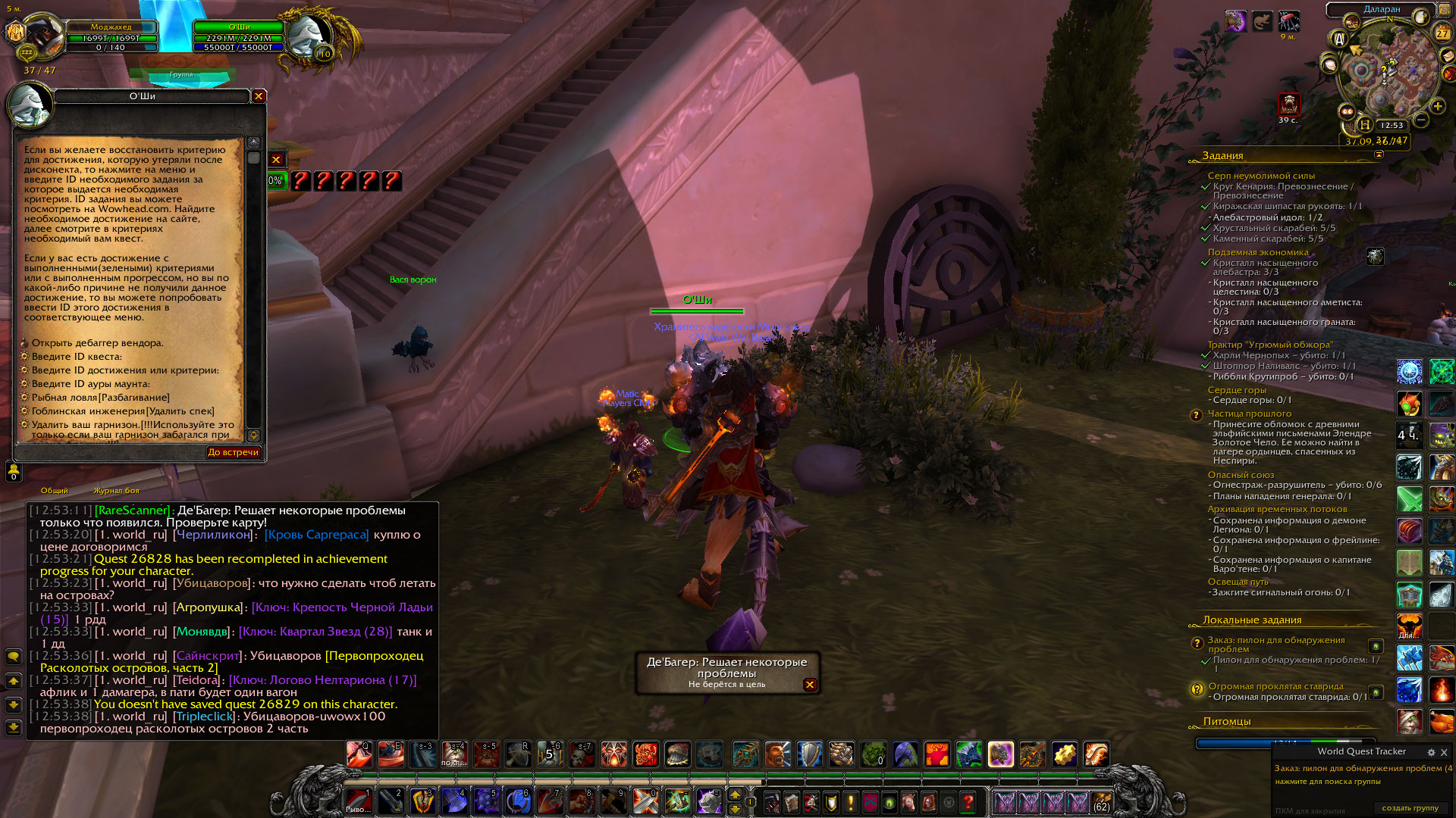 Добрый день! Скриншоты: 1) Диалог с Теразан на плато стихий 2) Место, которое указывает аддон для взятия задания и нет Теразан там 3) Проверка id 26828 и 26829 |