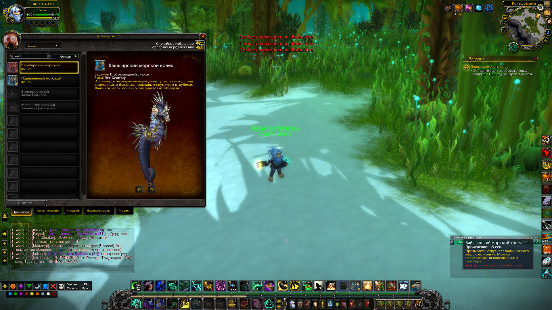 | Description | https://ru.wowhead.com/item=54465/вайширский-морской-конек Невозможно использовать в Вай'шире , хотя получается он по квестовой цепочке https://ru.wowhead.com/quest=25371/глубоководный-скакун и предназначен как раз для передвижения по Вай'ширу | ||||