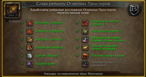 Доброго времени суток! 2 БАГ Делали Слава рейдеру Пандарии. Проблема возникла на достижении "Только не по ногам" Проходили несколько раз, бив только тело босса "Гаралона" как требует того достижение, но достижение не зачитывалось Проверил, у меня работает корректно. |