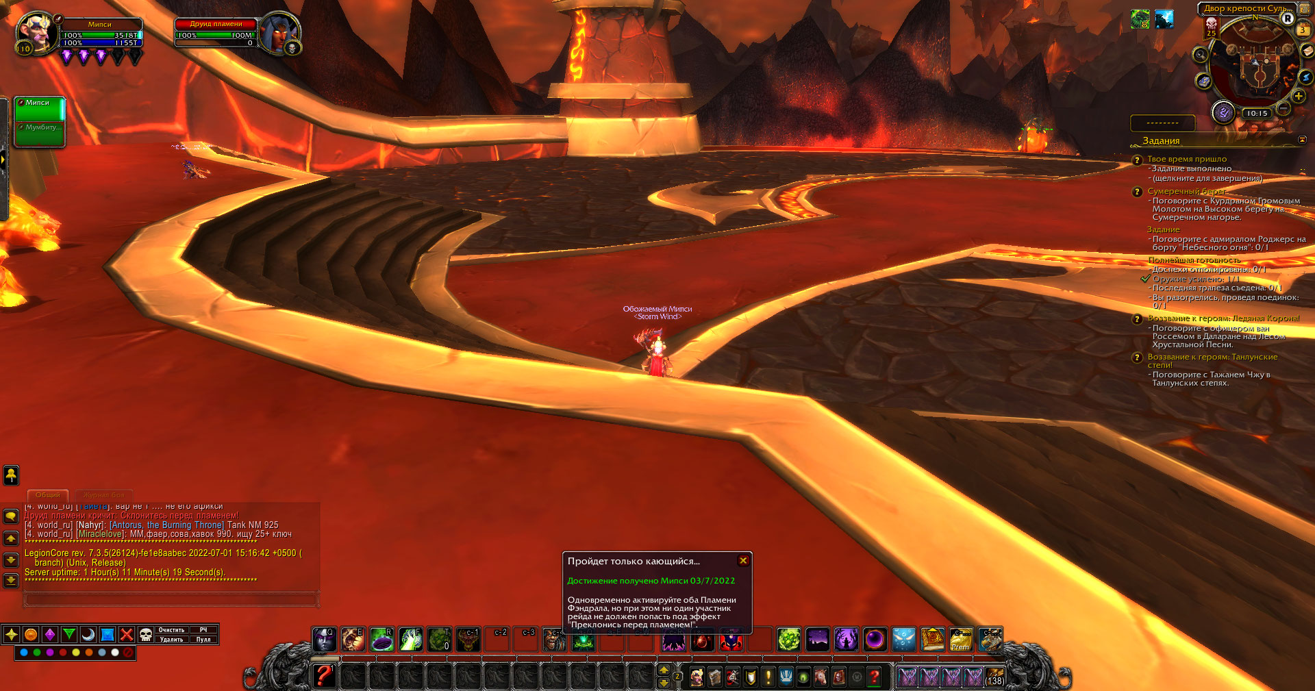 Только что проверил, достижение пройдет только кающийся работает прикладываю скриншот с командой .server info ( но существует баг с радиусом действия каста друида пламени который по окончанию каста бьет вплоть до моста и это нужно взять на заметку) WoWScrnShot_070322_101538.jpg (464,755 bytes) |