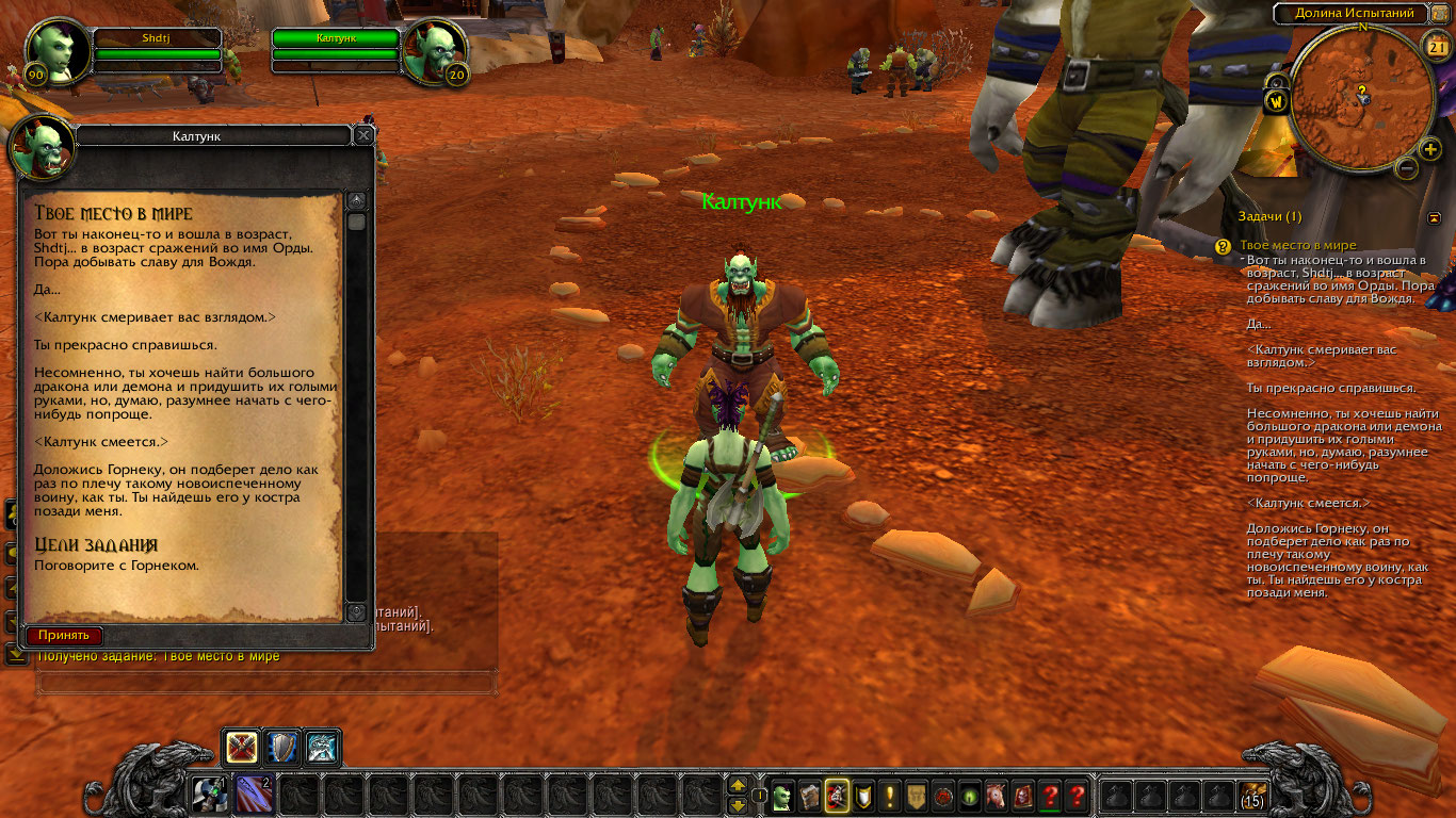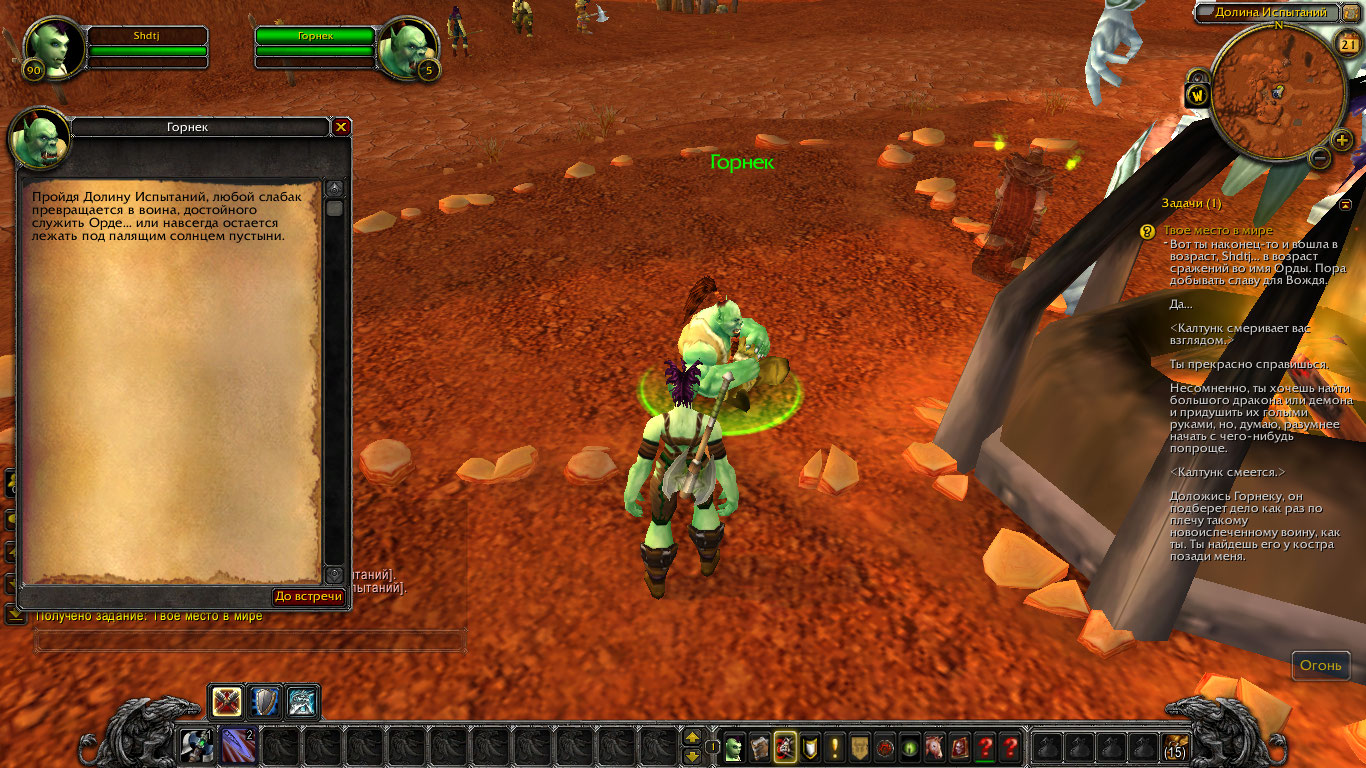 | Steps To Reproduce | 1. Создать персонажа расы "Орк" любого класса. 2. Взять задание "Твоё место в мире" у NPC(700017) "Калтунк". 3. Подойти к NPC (3143) "Горнек" нажать курсором на него. 4. Появится окно, с текстом. Отсутствует кнопка задания. | ||||