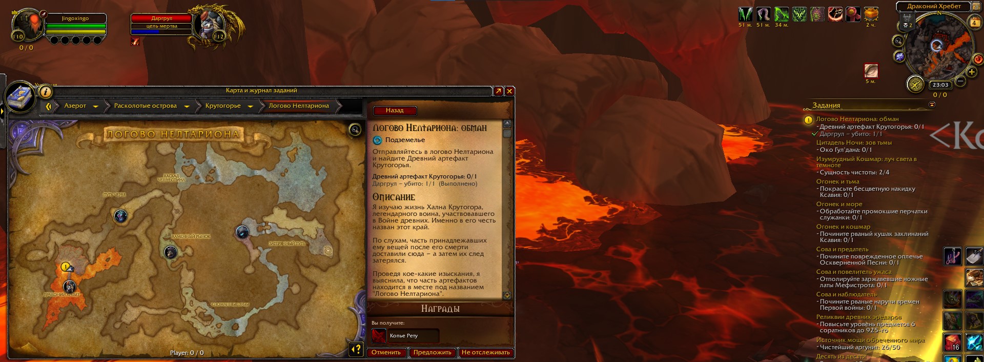 | Description | Добрый день, при выполнении квета на археологию "Логово Нелтариона: обман", нет древнего артефакта Крутогорья (копье Рету) в подземелье. | ||||