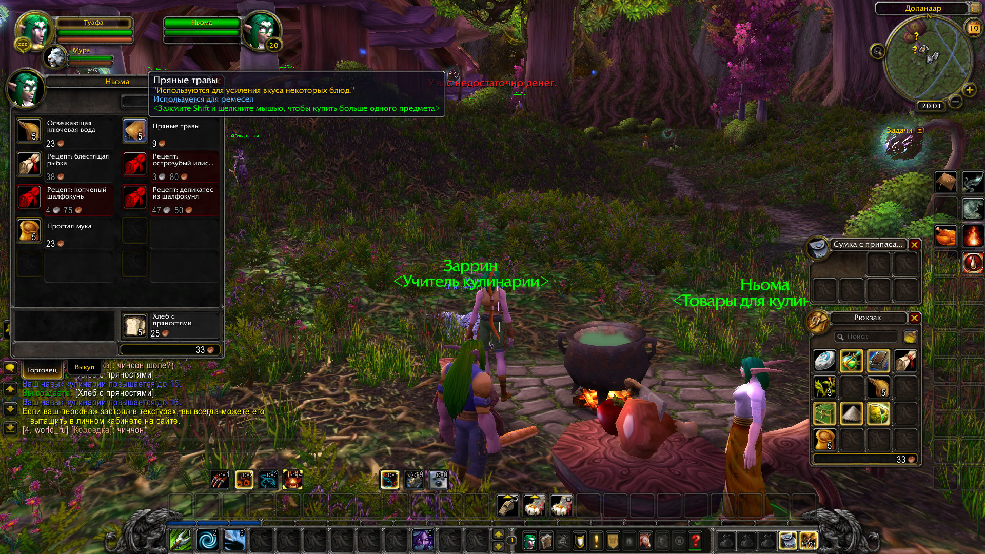 | Description | Столкнулась с такой проблемой. Необходимо было приобрести, у торговца товарами для кулинарии, "Пряные травы" и "Простую муку" для первичной прокачки кулинарии. Цена за "Пряные травы" 9 монет за 5 штук! Списывается при этом как если бы 1 пряная трава стоила 9 монет. Ещё со времен Классики WoW стоимость должна списываться за указанное количество. Стоимость списывается поштучно, если цифра у торговца указана в скобках (это означает что данного товара ограниченное количество в продаже). Если цифра указана без скобок и при покупке покупается определенным количеством (паком), как в данном случае 5 пряных трав в паке, то стоимость списывается указанная у торговца, а не умножается на указанное в паке количество товара. Проверьте пожалуйста! Страшно представить, если с остальными товарами так же везде. | ||||