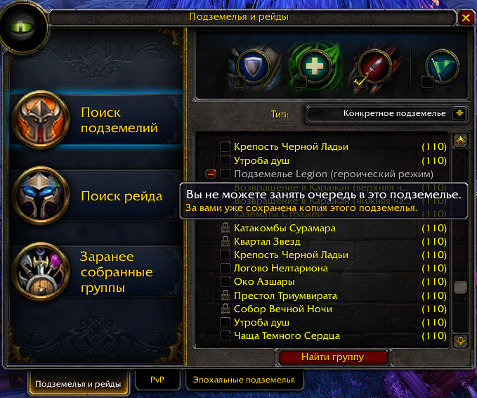 | Steps To Reproduce | Предусловия: Персонаж 110 уровня, выполнена 4 глава локации Сурамар Шаги воспроизведения: 1. Открыть окно "Подземелья и рейды" 2. Выбрать тип "Конкретное подземелье" 3. Попытаться выбрать "Катакомбы Сурамара" Фактический результат: Нет возможности выбрать флажок "Катакомбы Сурамара" Ожидаемый результат: Есть возможность выбрать флажок "Катакомбы Сурамара" | ||||