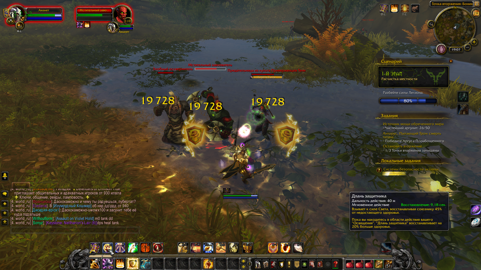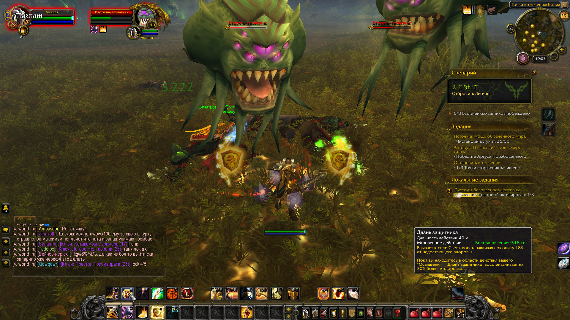 | Additional Information | Без озарения спел хилит лично у меня 37% и 45 с освящением. В момент понижается до 14% и 18 с освящением. Не зависимо от количества здоровья он исцеляет именно те же 14(18)%. На скриншоте с воспроизведённым багом есть вероятность, что в мою сторону полетела глефа вражеского ДХ и попала по мне. После снятия боя, проценты вернулись на круги своя и, когда я попытался швырнуть щит мстителя в босса, щит ударил того вражеского ДХ и проценты вновь снизились. | ||||