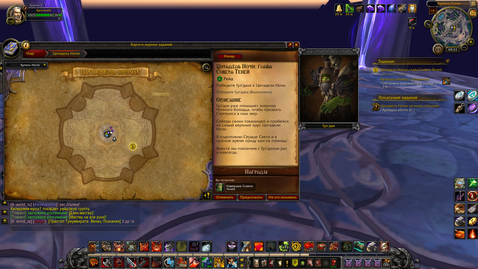 | Description | По квесту: Цитадель Ночи: глава Совета Теней(https://ru.wowhead.com/quest=45417/%D1%86%D0%B8%D1%82%D0%B0%D0%B4%D0%B5%D0%BB%D1%8C-%D0%BD%D0%BE%D1%87%D0%B8-%D0%B3%D0%BB%D0%B0%D0%B2%D0%B0-%D1%81%D0%BE%D0%B2%D0%B5%D1%82%D0%B0-%D1%82%D0%B5%D0%BD%D0%B5%D0%B9).Требуется убить NPC Гул'дан. Что я и сделал. | ||||
