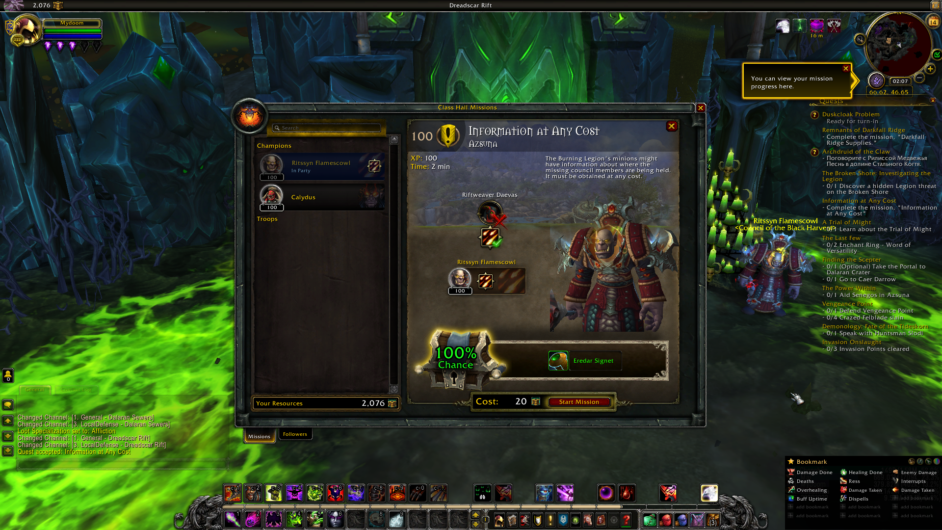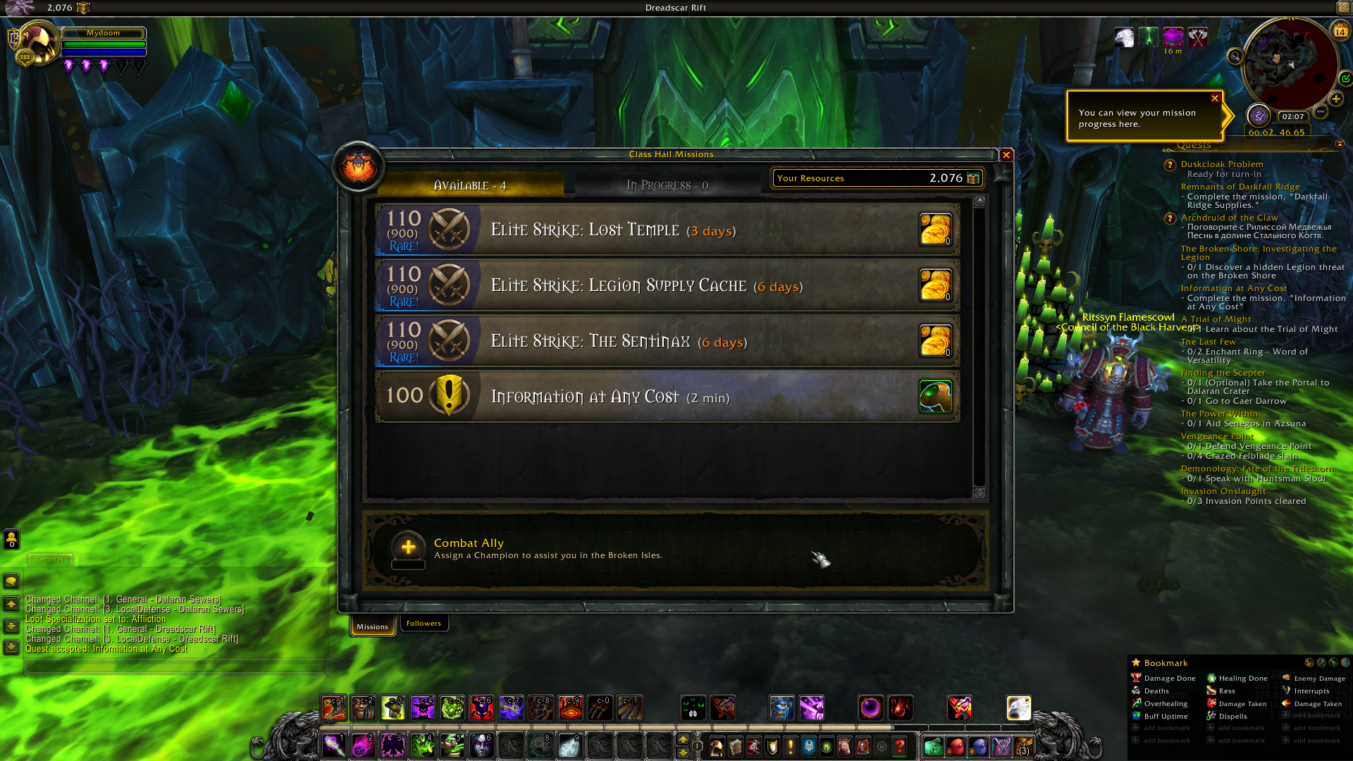 | Description | On x100, my mission table doesn't work as a warlock. Trying to send any champion on a mission acts like the mission was never sent on in the first place. So I can't progress on the order hall questline which is necessary to unlock the NPC to research 2 legendaries. This means I also can't send any champions on missions or recruit troops. I'm sending tickets to manually complete each mission step, thus haven't gotten to the order hall advancement NPC. But given how everything else isn't working, I expect to have problems with him too. | ||||