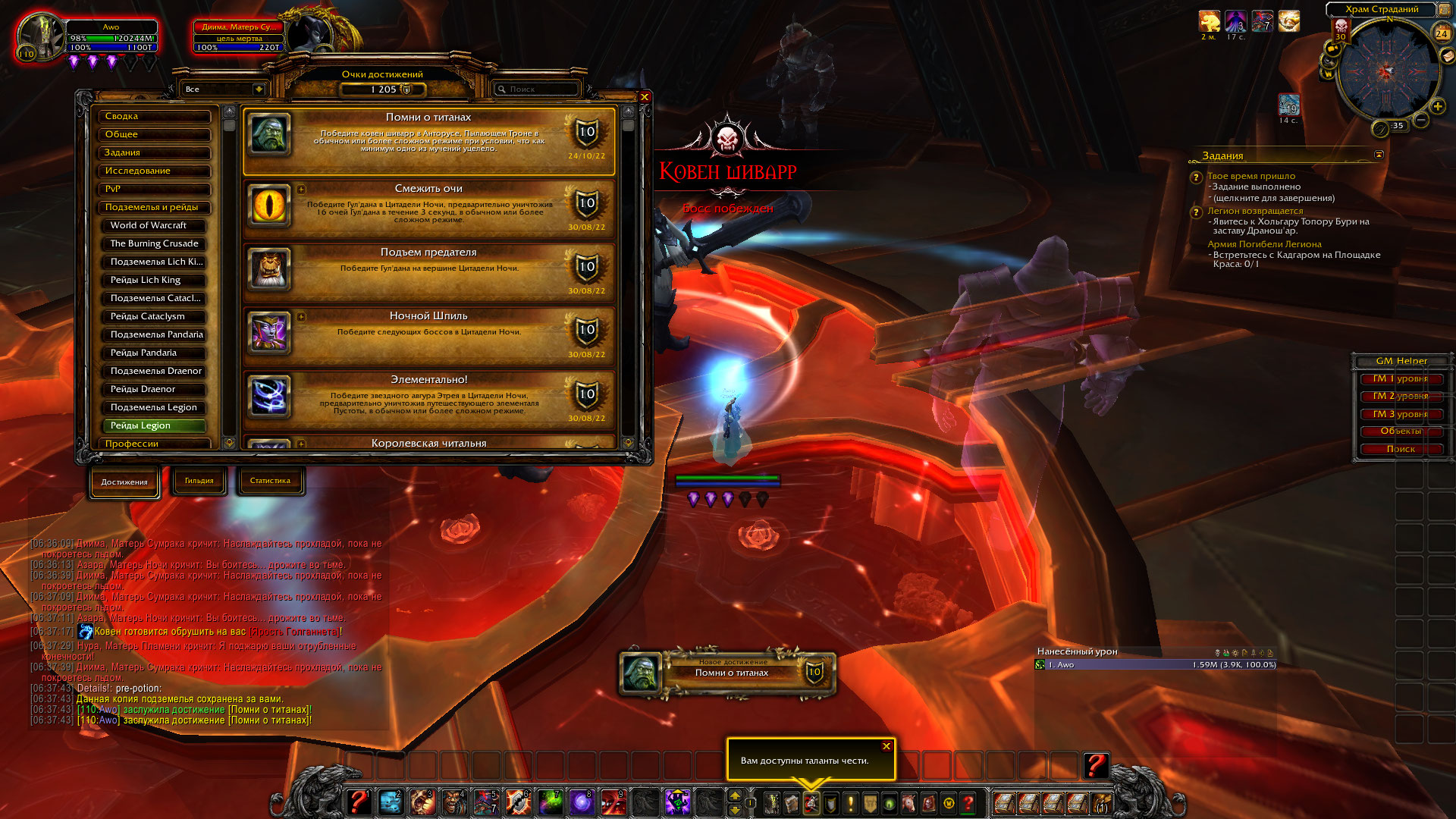Здравствуйте! Проверил, сама ачива работает корректно, ниж прикреплю скриншот. Там дело в переводе, точный перевод "под конец боя должно остаться как минимум одно из КАЖДЫХ 4-ех мучений" WoWScrnShot_102422_183745.jpg (569,433 bytes) |