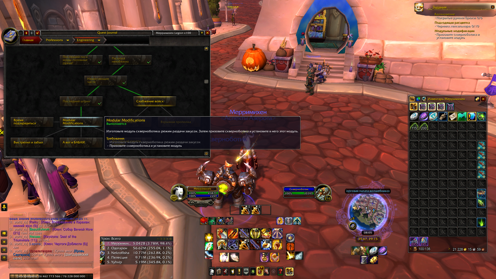 | Description | Скрафтив "Модуль скверноботика: режим раздачи закусок", призываю Скверноботика, использую на нем модуль - не засчитывает. Отмена задания, очистка КЭШа в папке с игрой, исправление персонажа в личном кабинете и услуга НПС с исправлением в Даларане не починили квест. Без этого квеста не могу продолжить цепочку квестов на инженерное дело. | ||||