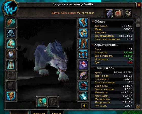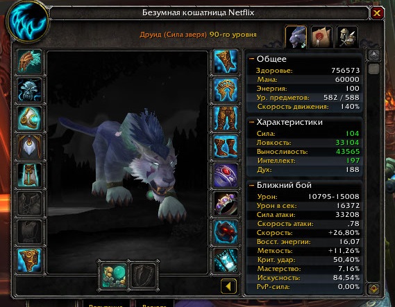 | Description | Спек - Сила зверя 1)Неправильная формула которая расчитывает урон от оружия в форме кота, урон ниже чем должен быть, необходимо перенести формулу с живых серверов пандарии. 2)Неправильная формула расчета силы атаки, у нас Сила атаки в облике кошки и медведя идет просто 1к1 от значения ловкости(33.000 ловкости = 33.000 силы атаки, см.скрин) Должно быть как и у остальных подобных классов, например разбойника, то есть в 2 раза больше, если 33.000 ловкости = 66.000ед силы атаки. 3) Критичный баг, Скорость восстановления энергии в облике кошки, завышена в несколько раз, для сравнения два одинаковых друида на скринах. (Внимание, это так же относится к разбойнику и монаху!) | ||||