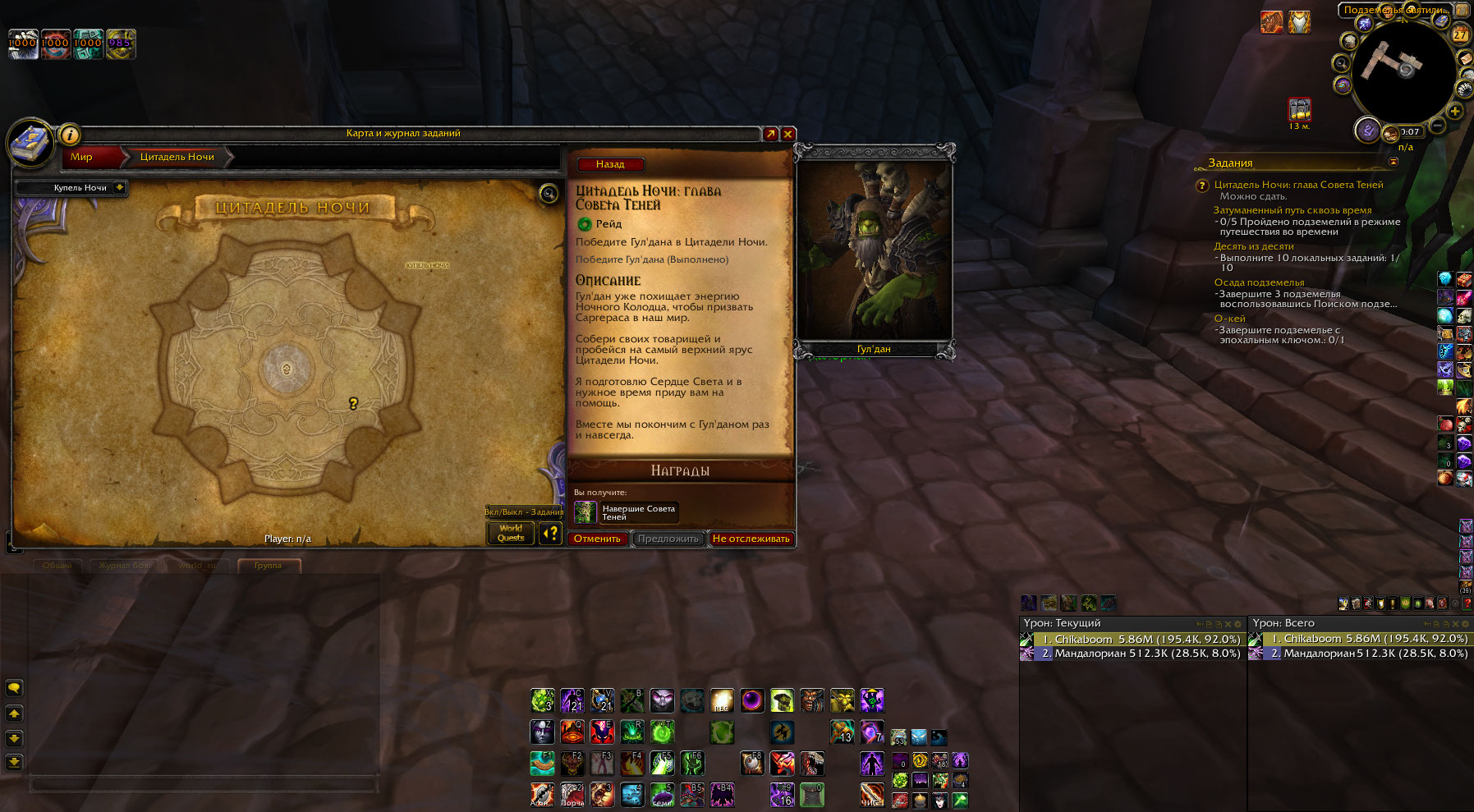 | Description | Цепочка квестов Сурамара "Восстание" заключительный квест данной цепочки Цитадель Ночи: глава Совета Теней После убийства Гул'Дана квест засчитывает что можно кому-то сдать, но НПЦ нигде нет. Помимо платформы Гул'Дана, пытался посмотреть нижний ярус предласт босс и еще ниже где 1 сфера, но нигде нет НПЦ для сдачи квеста. Данная цепочка нужна исключительно для получения ездового маунта Манапард чародея Надеюсь проблема как-то решится и можно не обнулять данную цепочку. | ||||