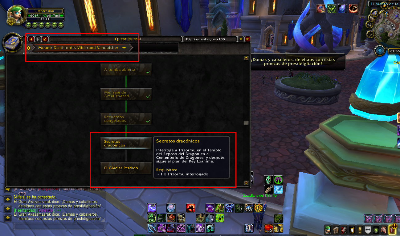 | Description | I can't complete the quest chain for the class mount, since I don't have the "Draconic Secrets" quest, even though the addon says I have to interrogate "trizormu" in the dragon graveyard. I kindly request that you complete the mission for me to continue with the chain. Note: I ran through all the npc from the first mission and none of them allow me to continue. https://www.wowhead.com/es/quest=46812/secretos-dracónicos | ||||