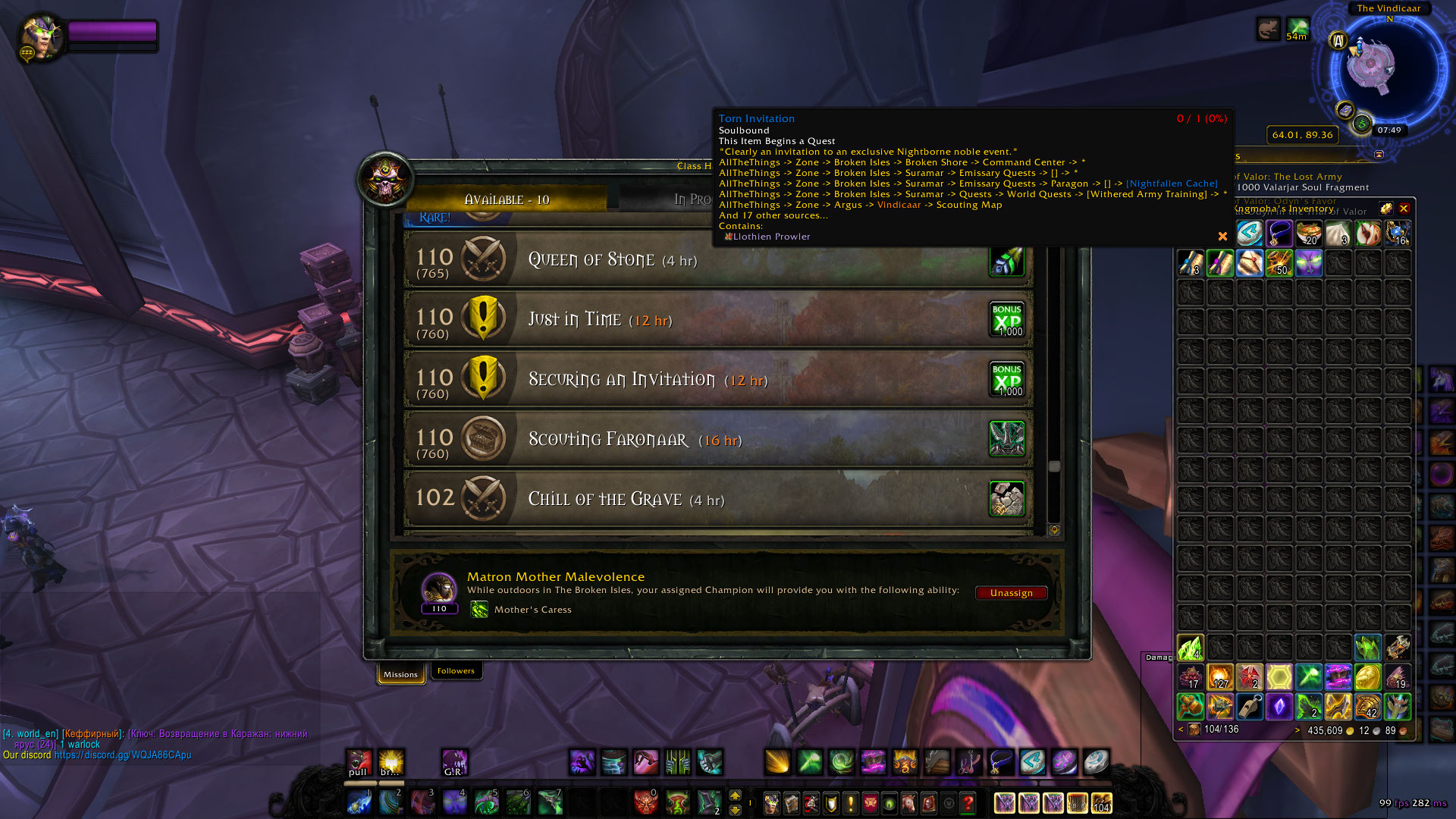 | Description | hi I got the item "Torn invitation" that starts the quest "[A "Noble" Event]" that will reward "[Llothien Prowler]" mount. the quest objective is to send my champions into class hall missions to get it done, but the missions rewards are totally wrong!! they only reward XP instead of items to finish the quest!! can you please help me with this issue thank you Character name: kngmoha Location: Demon Hunter Class Hall Realm: Legion x100 | ||||