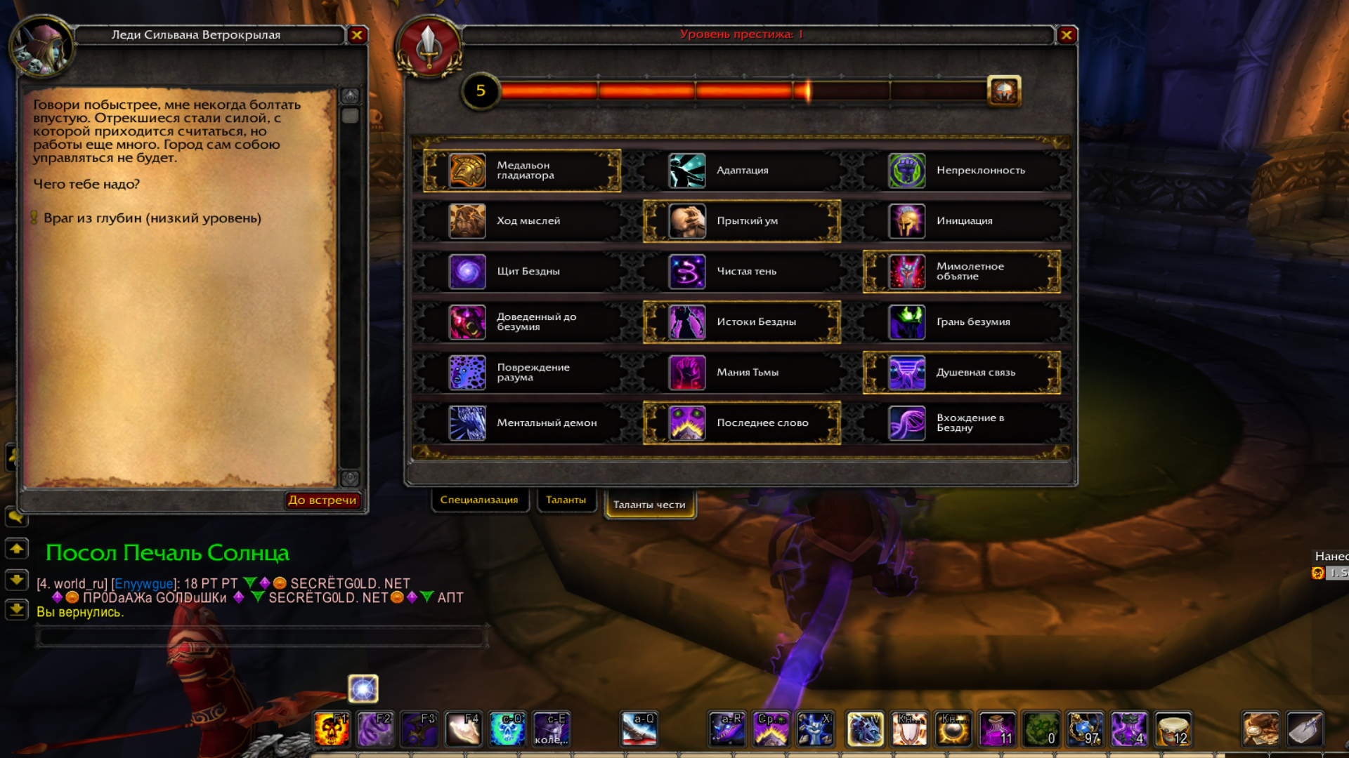 | Description | Получено 50 уровней чести и 1-й уровень престижа, но квеста "Награда Победителя", который должна дать Сильвана в Подгороде, нет. | ||||