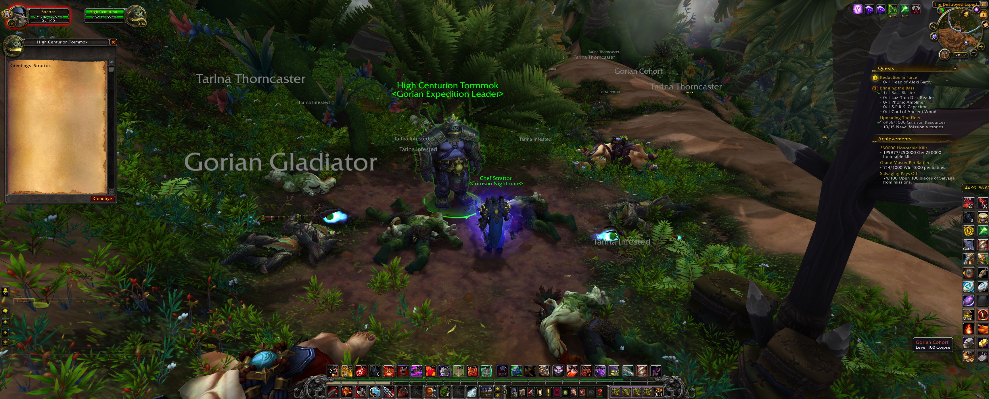 | Steps To Reproduce | He's standing in the top of a small hill with few mobs around him. Once you defeat the mobs, another mobs appear, and you must keep defeating the mobs until https://www.wowhead.com/npc=83871/woodfist appears. After you kill him, the quest https://www.wowhead.com/quest=36037/a-centurion-without-a-cause will appear and you'll be able to recruit him. Below you can see the screenshot with the NPC in question dialog box opened with no options to recruit him. | ||||