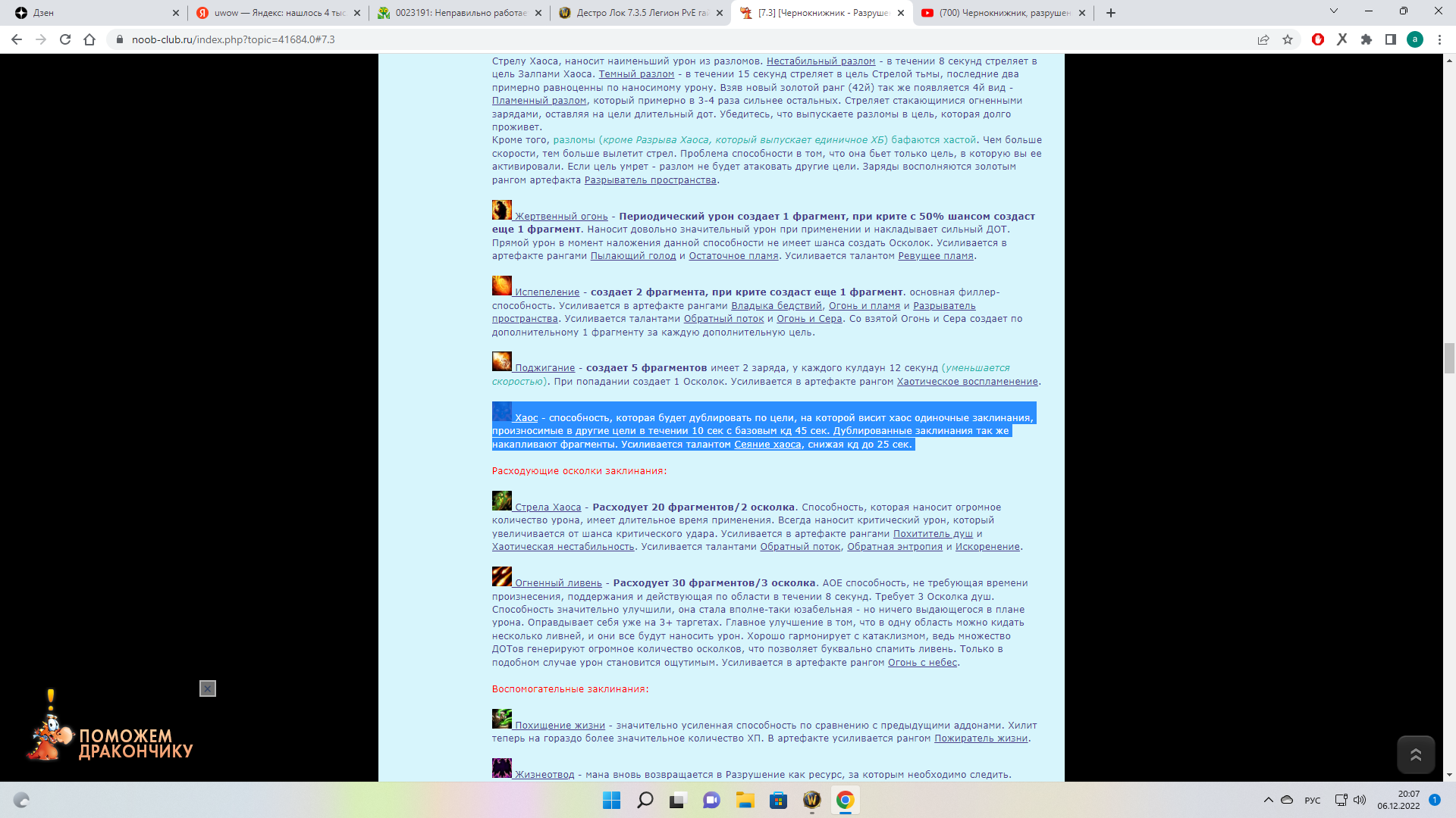 | Description | Суть проблемы в том, что способность https://www.wowhead.com/ru/spell=17962/%D0%BF%D0%BE%D0%B4%D0%B6%D0%B8%D0%B3%D0%B0%D0%BD%D0%B8%D0%B5, продублированная способностью https://www.wowhead.com/ru/spell=80240/%D1%85%D0%B0%D0%BE%D1%81, должна давать в два раза больше фрагментов осколков душ, если быть точнее, то без хаоса восполняется половина осколка души, а с хаосом на другой цели - 1 полный осколок души. Это очень ослабляет данную способность, в Анторусе на 8 боссах можно найти применение этой способности и накрутить дпс. Эту особенность для хаоса ввели еще в патче 7.2.5. В комментариях кину ссылку на работоспособность хаоса на uwow, скрин с сайта allmmorpg, где указаны изменения в патче 7.2.5 для дестро лока и ссылку на видео с офа, где демонстрируется ротация с применением хаоса. | ||||