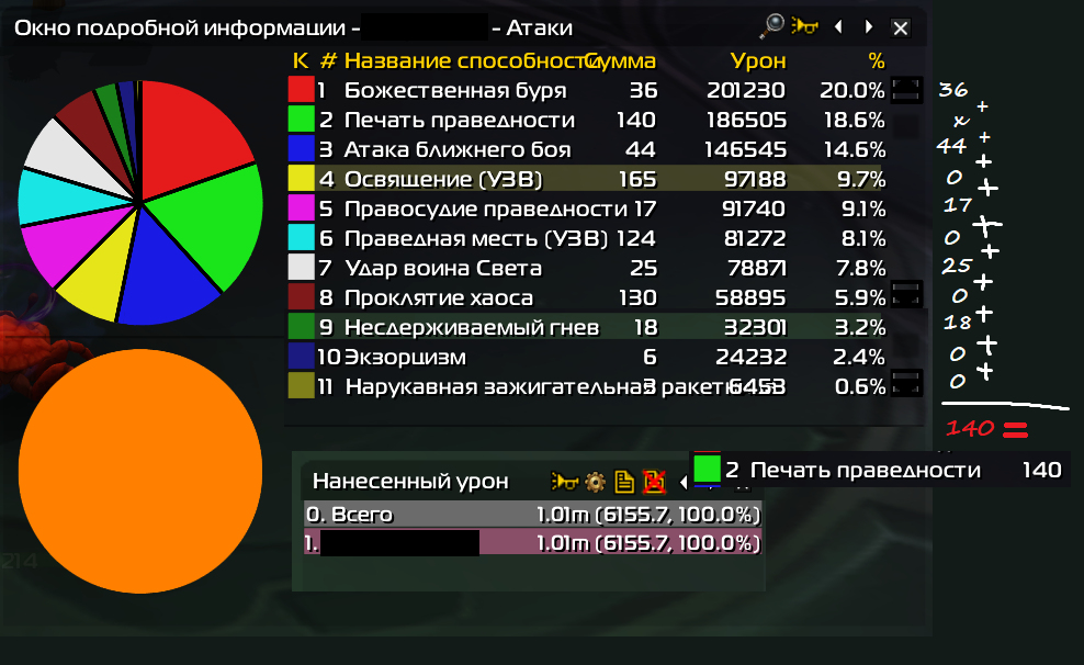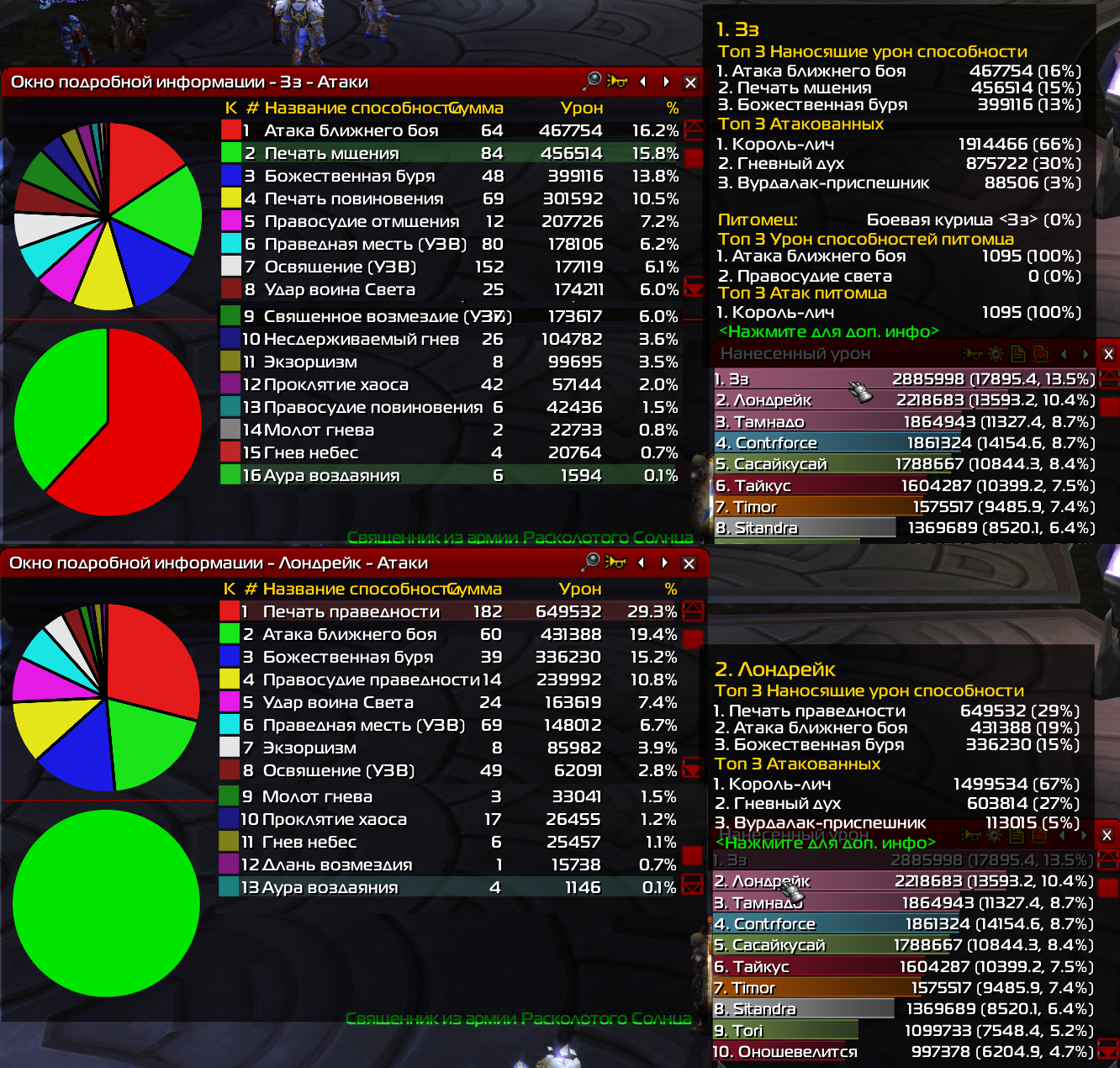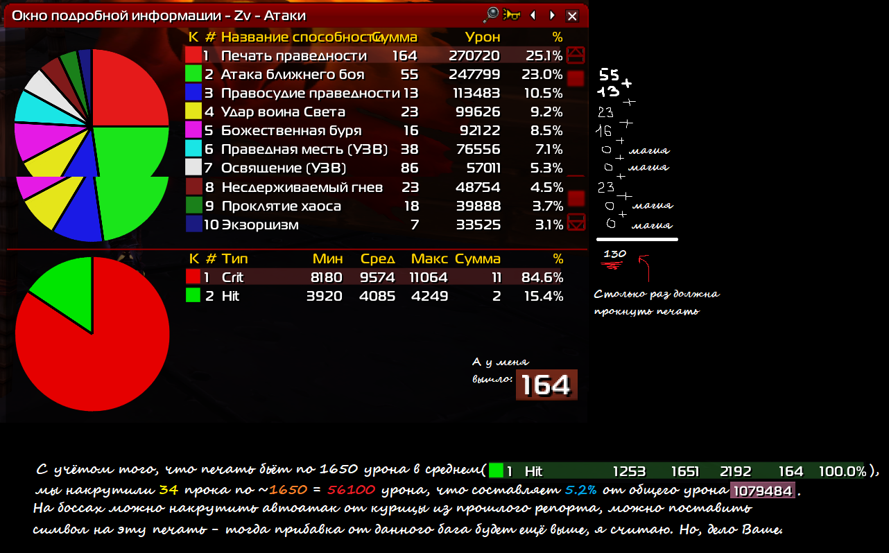 Подсчитал проки печати праведности на скрине (лич), у меня получилось 137 проков(60АА+39Бурь+14Правосудий+24УВС), это без учёта возможных промахов/парирований. Итого 182-137=45 бонусных проков печати "из неоткуда". --- UPD: я в конце боя в треш переключился, скрин рекаунта Зз не даёт информацию по прокам. Соре, поздно заметил. |