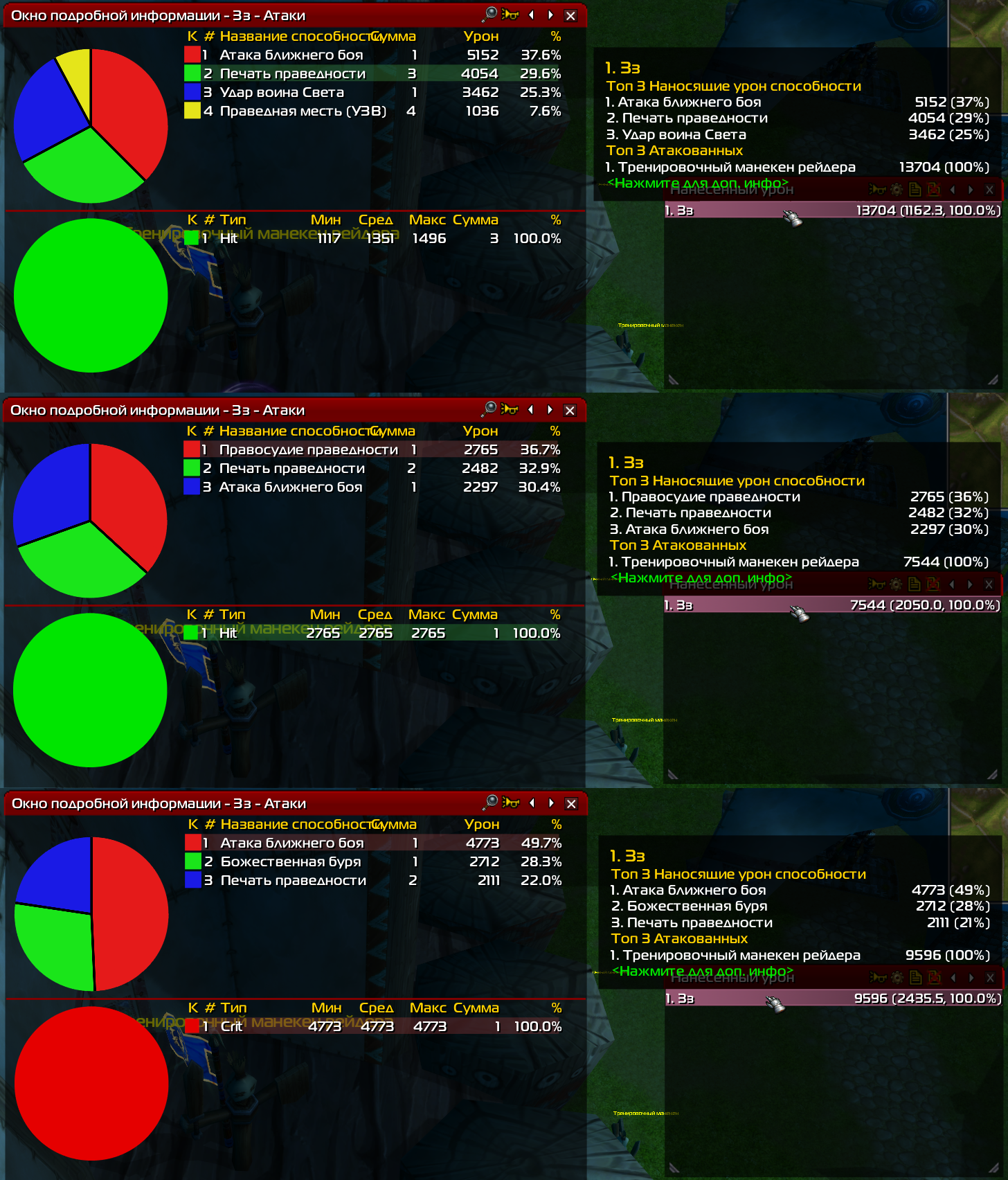 Печать мщения стакается, печать праведности наносит урон от любой атаки ближнего боя. Я продолжаю бить манекен и получаю ровное количество проков. |