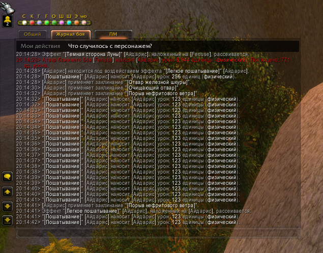 Из второго скриншота видно, что я под действием дебаффа пошатывания находился 10 секунд, а должен был находиться 13 секунд, и количество тиков должно было нанестись в сумме 21шт (1 тик до активации приостановки "эффекта приостановки получения урона от пошатывания" и 20 тиков урона после получения урона и окончания времени действия "эффекта приостановки..."), а дебафф этот урон распределил на 14 тиков (вместо 20). |
