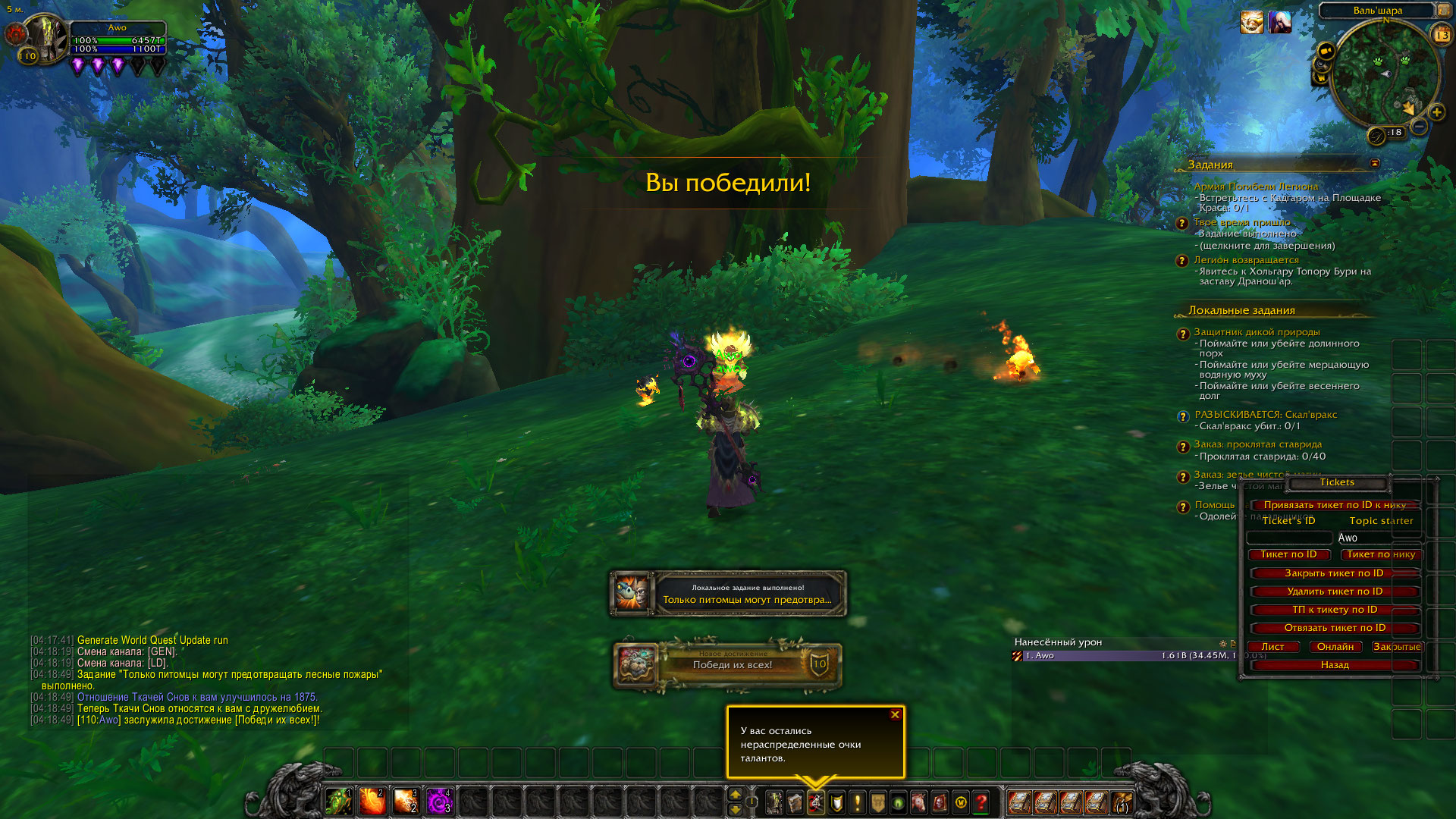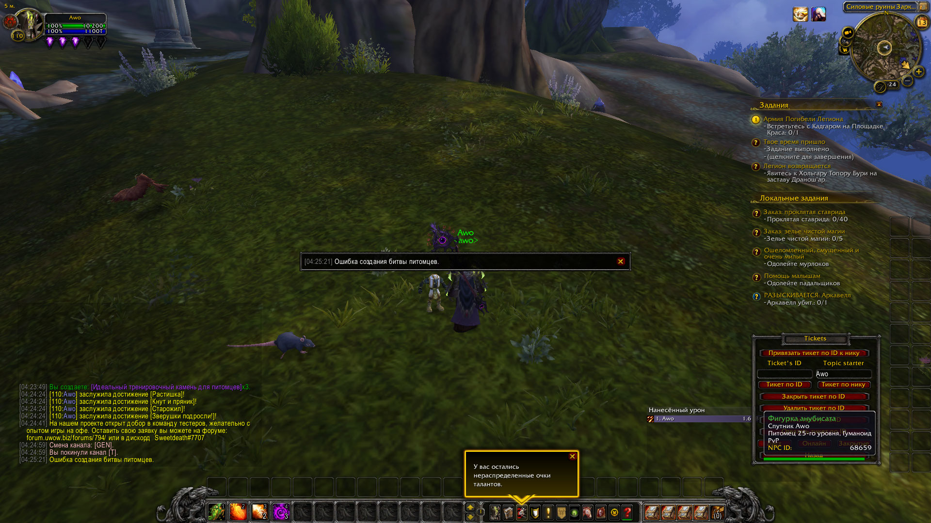 | Description | Локальные задания Легиона с питомцами не работают; 1. Вальшара "Только питомцы могут предотвращать лесные пожары" - нужно поймать или убить трёх питомцев - я поймала, но квест не засчитывается. Убиваешь второго, а первый не засчитывается и т.д. 2. Асуна -" помощь малышам" - сразу выбрасывает из боя. Если есть возможность, то почините, пожалуйста. | ||||