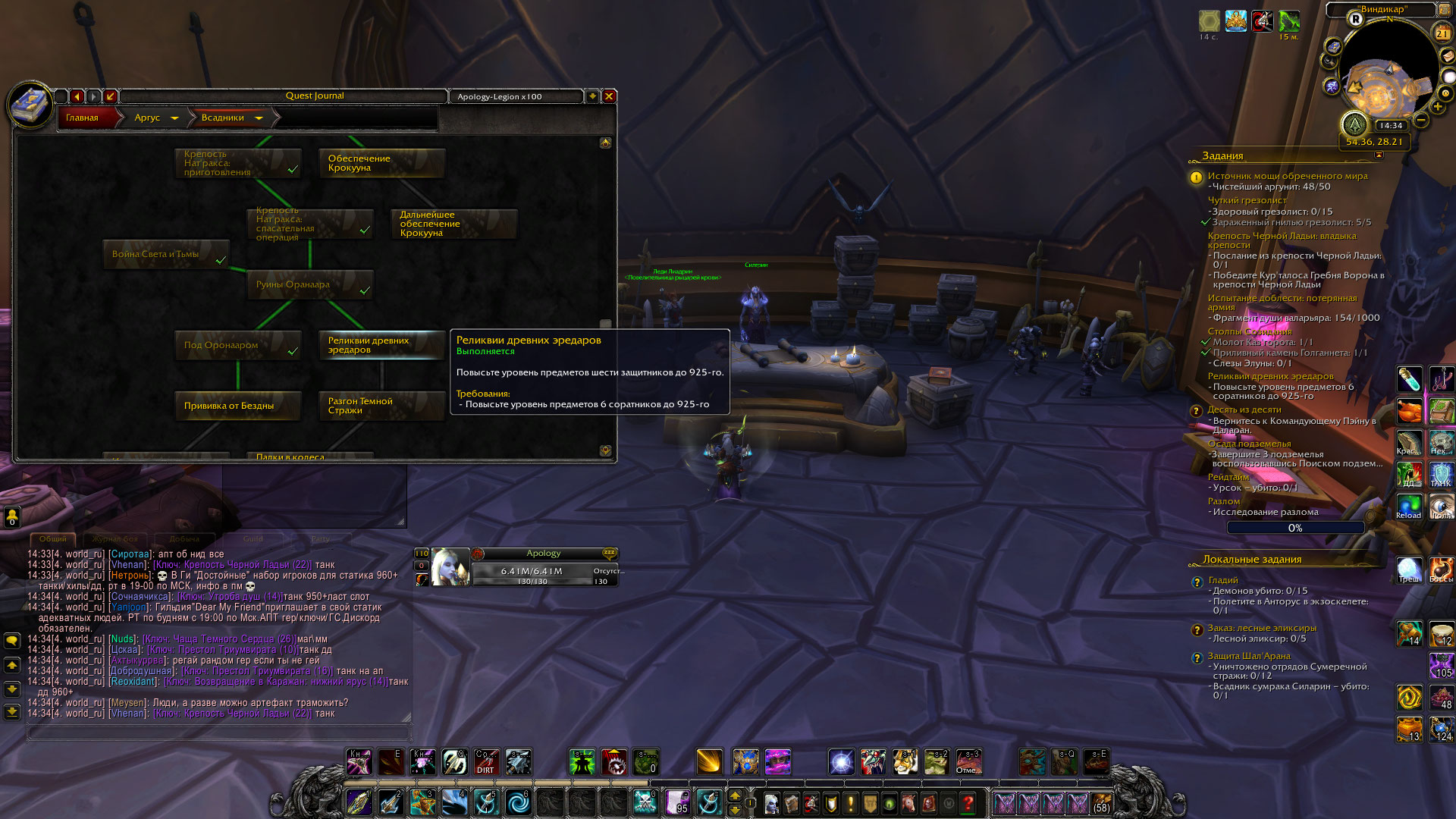 | Additional Information | 1. Порывшись на wowhead.com люди утверждают, что квест всегда должен давать данный итем, но сам квест может появляться не всегда (как утверждают - 1 раз в 3 дня, но может и сразу). На нашем же сервере он появляется всегда стабильно (то есть при успешном/неуспешном выполнении квеста он появляется заново сразу же). 2. При открытии данного квеста поле "Награда" - пустое. Но если релогнуться, в поле "Награда" появится "Бонусные очки опыта соратника "+ 1 000 опыта"". 3. Данный квест ("Доспехи эредаров" (1772)) я делаю уже примерно месяц постоянно, надеясь на положенную награду, но ее не было ни разу. 4. Скрин самого квеста (но уже после релога во вложении). 5. Скрин из аддона BtWQuests о текущем прогрессе в цепочке "Всадники" во вложении. | ||||