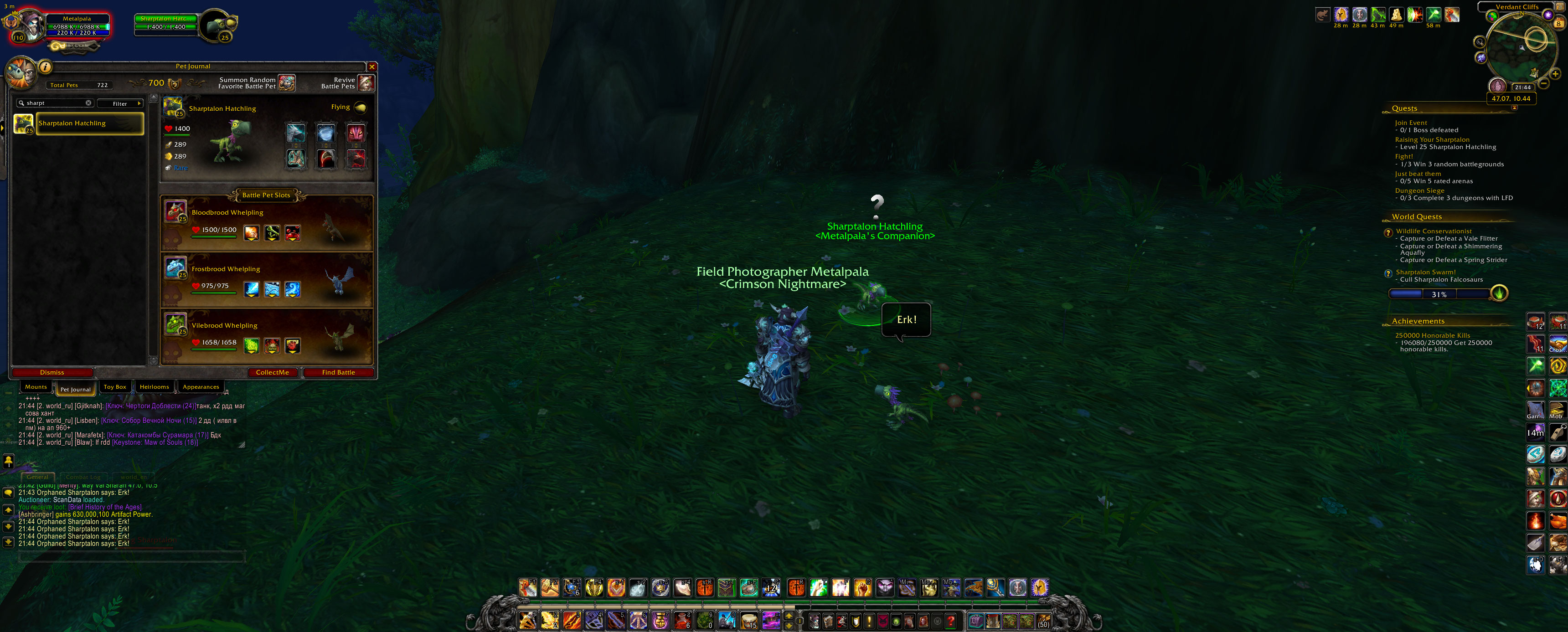 | Description | This quest is kinda bugged. I have the Sharptalon Hatchling battle-pet ( https://www.wowhead.com/npc=115786/sharptalon-hatchling#comments ), and he's already level 25. The quest requires to level up my pet to level 25, and as he's already 25, there's no way to complete the quest. I believe the quest should verify the sharptalon's level, if he's 25 the quest should auto-complete. I've tried to follow up the stepes to acquire a new hatcling, but can't be done, the pet is unique and cant be abandoned to try catching another one. Screenshots bellow showing the problem. | ||||