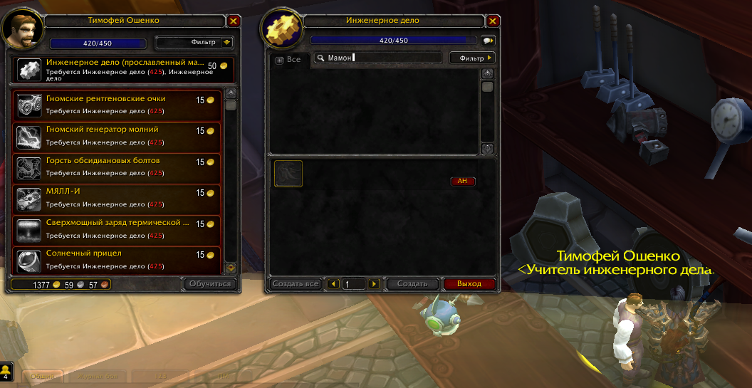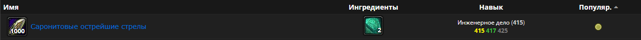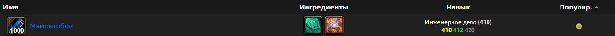 | Description | У инженерного дела отсуствует 2 не мало важных рецептов у учителей профессий, крафт саронитовых стрел и мамонтобои, открываются с 410 уровня инженерного дела, на 420 лвле инженерного дела нету ни у одного учителя профессии, не нашёл. | ||||